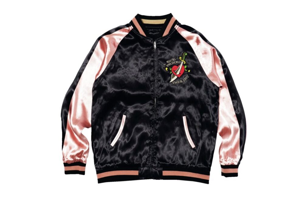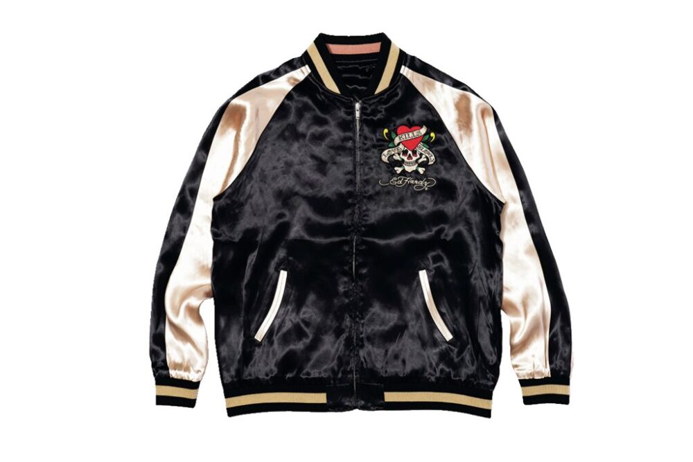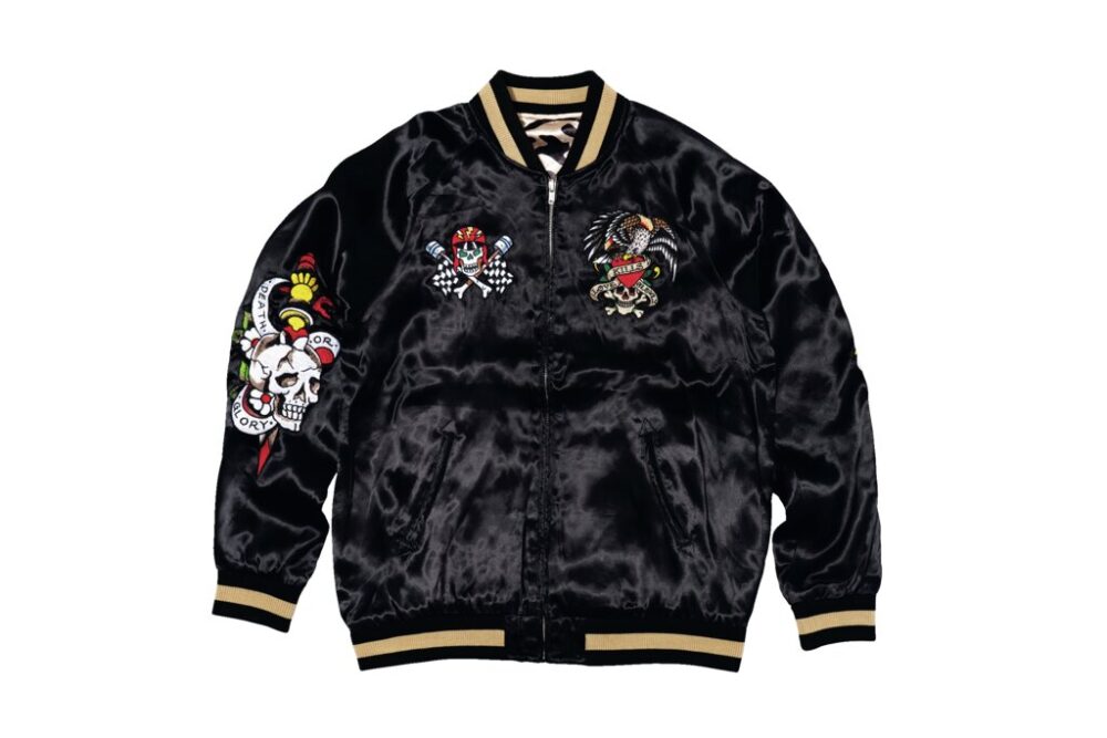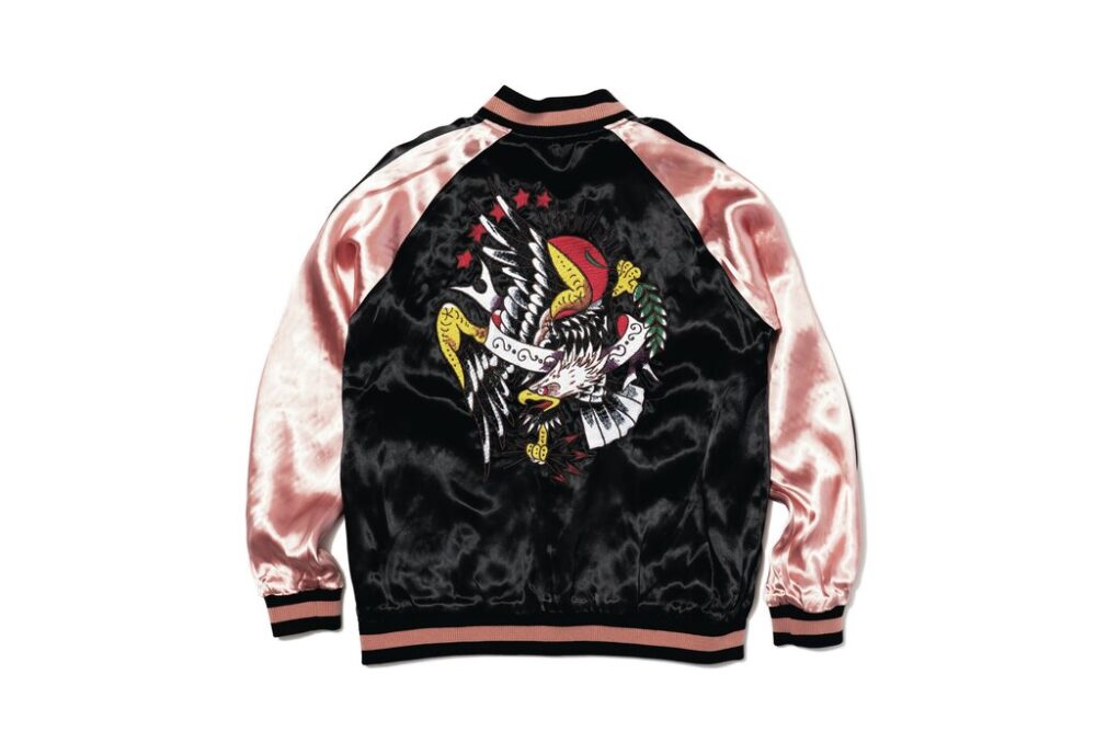 袖のサテン生地を切り替えしたオーソドックスなラグランスリーブデザインのスカジャン。ブラック×エクリュ(生成り)とブラック×ピンクのリバーシブル仕様となっており、それぞれの面で異なるドン・エド・ハーディーのアートワークが刺繍される。