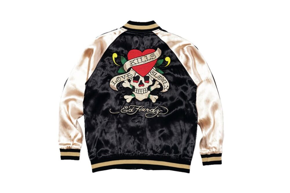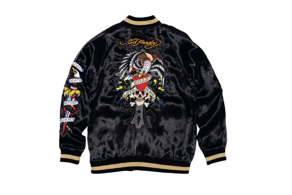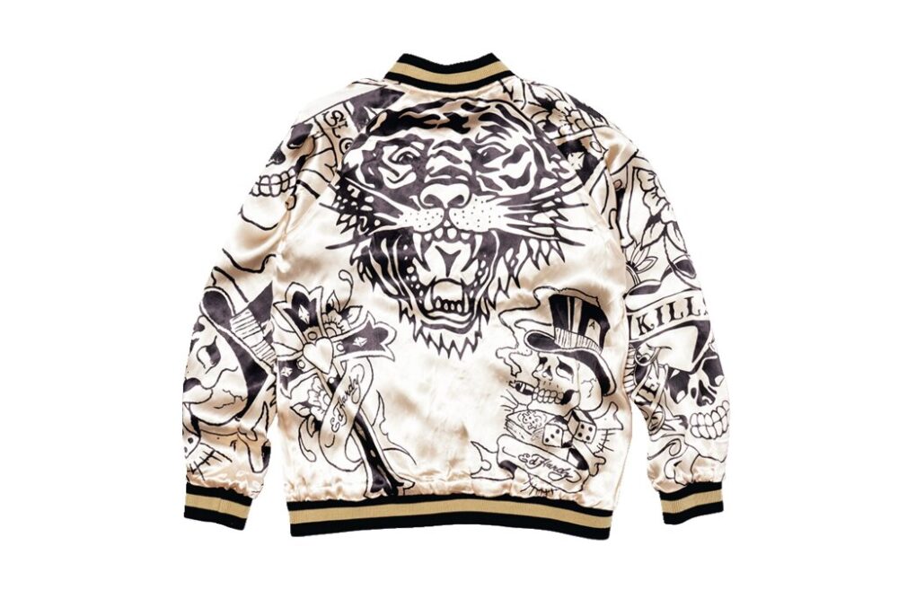 ドン・エド・ハーディーの作風は、現代アート風にアレンジされたアールヌーヴォー調のデザインや、日本の入れ墨に用いられるデザイン・彫師技術を取り入れている。彼の多彩なタトゥーデザインを全面に刺繍で散りばめた豪華な一着。