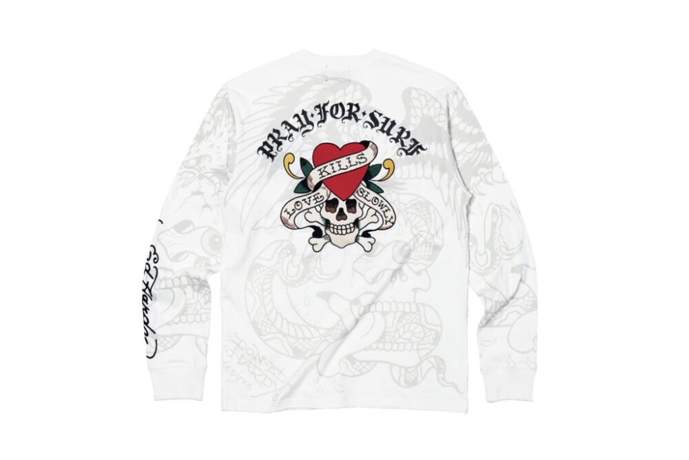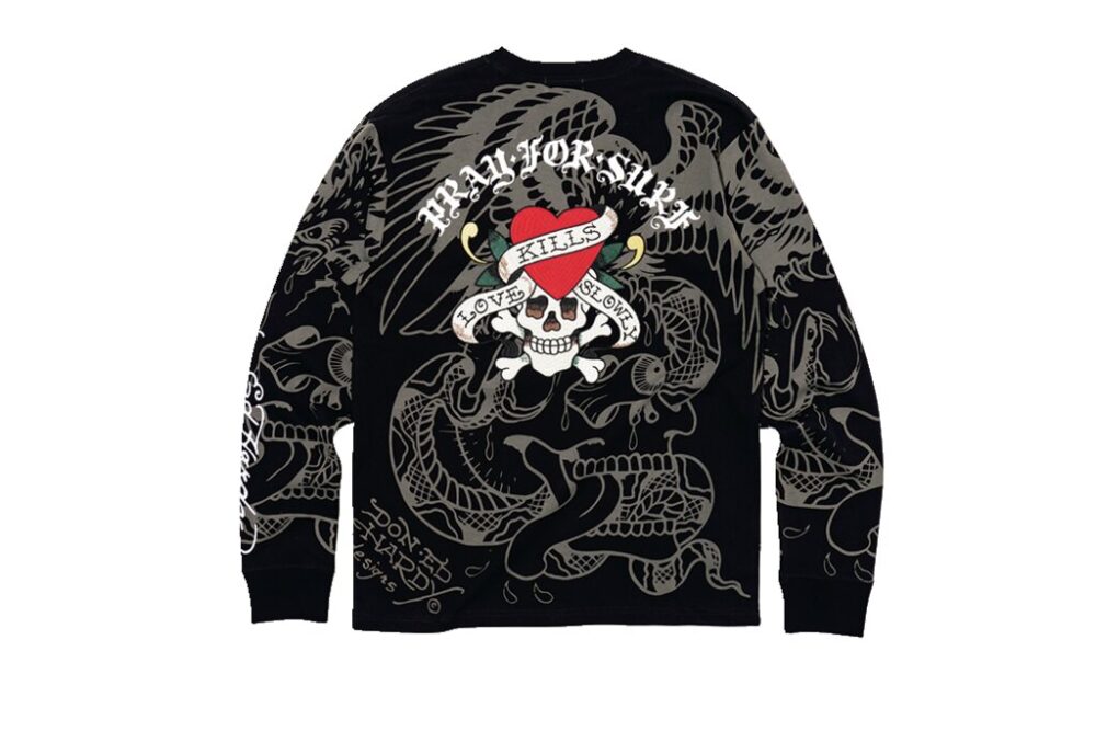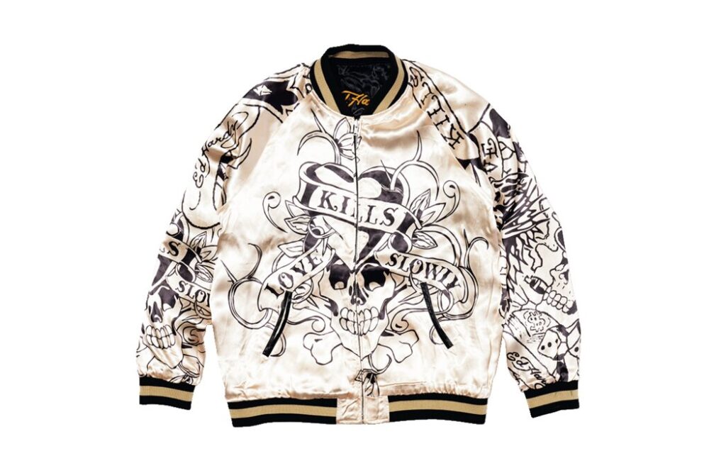 1972年にドン・エド・ハーディーがカリフォルニア州サンディエゴにタトゥーショップを開いたときにデザインした「LOVE KILLS SLOWLY」のタトゥー。彼を代表するプロダクトイメージというタトゥーデザインを刺繍にて落としこんだ。