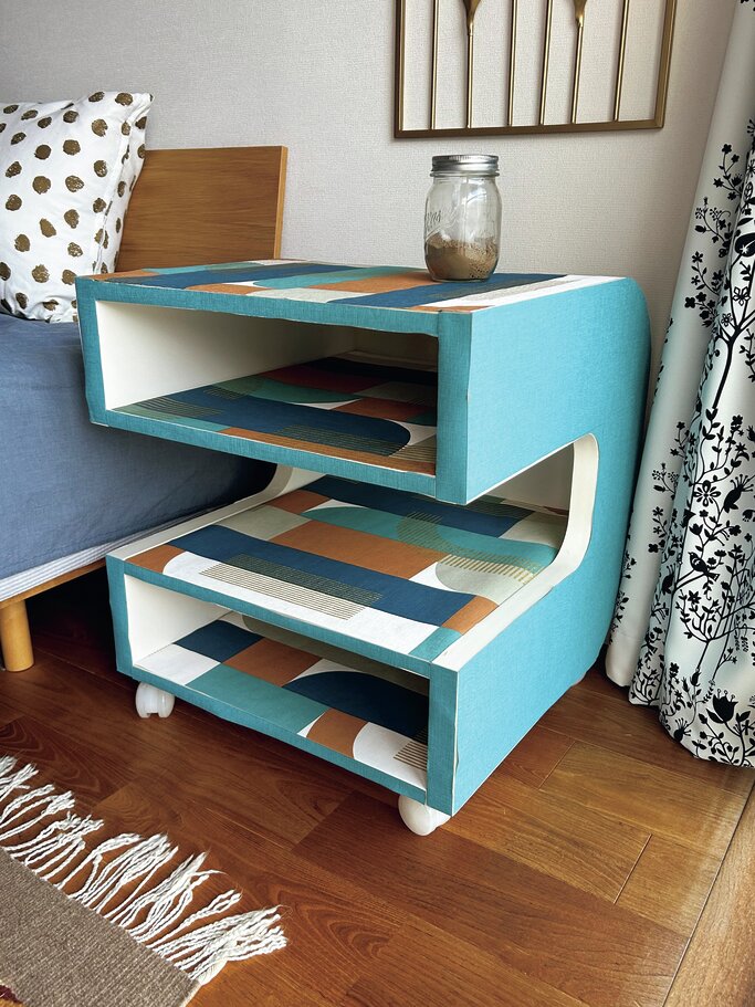 テーマはミッドセンチュリー。部屋の一面だけグレーブルーなので、青を基調とした壁紙を2パターン購入。棚板に柄もの、それ以外は無地にしてみた。どちらかというとあまり器用ではないので、カットが雑だったり、ちょっとはみ出たり……。特にRのついた部分は貼ってからカットしたので、だいぶ粗い。実のところ、内側のサイド部分とR(曲線)の付いた下の棚の両端のことをすっかり忘れていたため紙を用意していなかった。