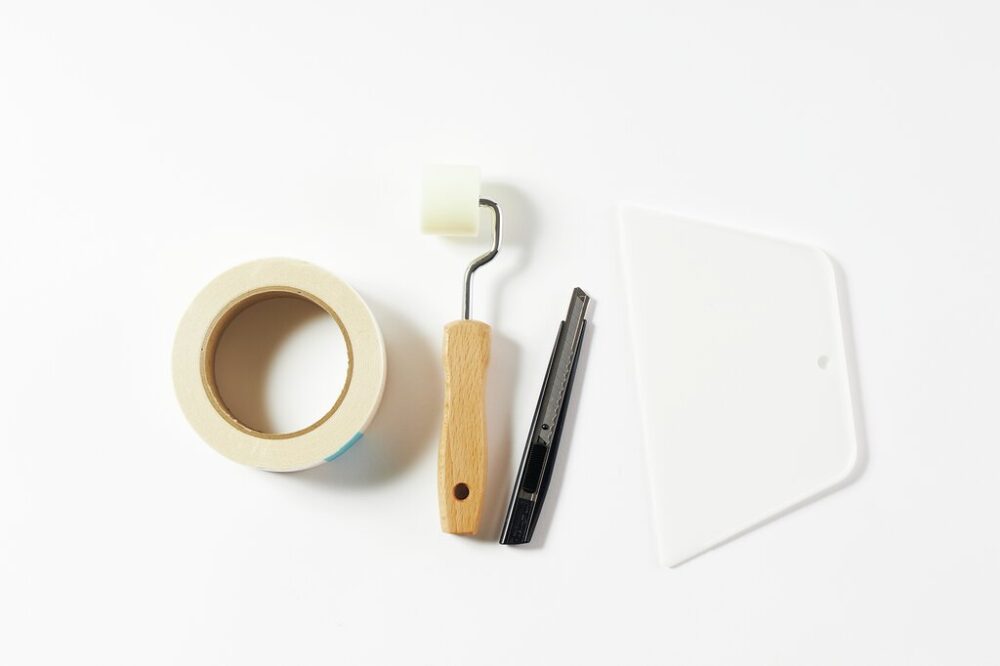 必要な道具は、両面テープとカッター、ローラー、ヘラ。WALPA STORE TOKYOではこれらも用意してくれるから初めてでも安心。