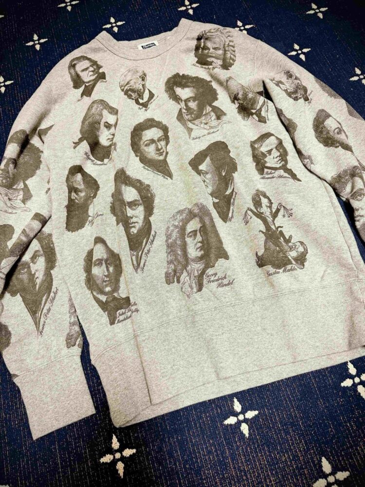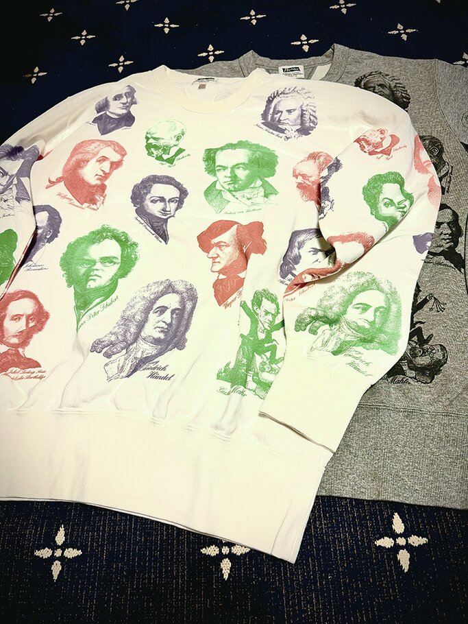 バッハ、ベートーベン、モーツァルト、ショパン、シューベルト、ブラームス、チャイコフスキー……。いろんな音楽家の顔と名前を覚えた。このスウェットに初めて出逢った時、とても懐かしく、旧い友だちとの同窓会に参加している気分になった、と言ったら大袈裟だろうか。でも、興奮しすぎて、スマートクロージングストア原宿店の姫野さんに即ライン送信。「一番大きなサイズを両色予約!」と。