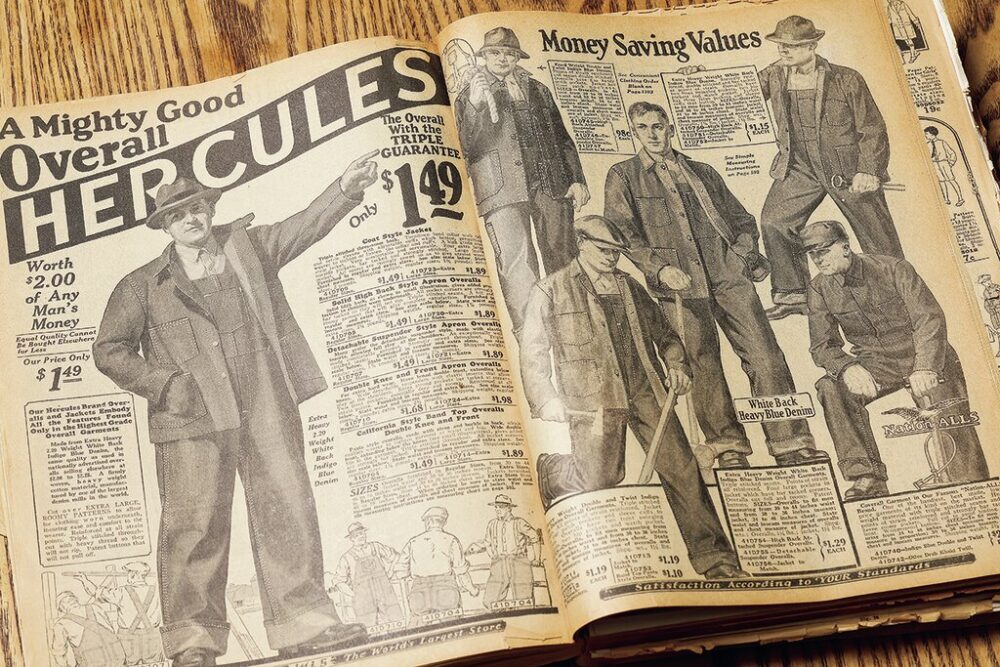1920年代後半の「シアーズ」のカタログ。オーバーオールの上にカバーオールを羽織ったスタイルはワーカーたちの定番スタイルだった。
