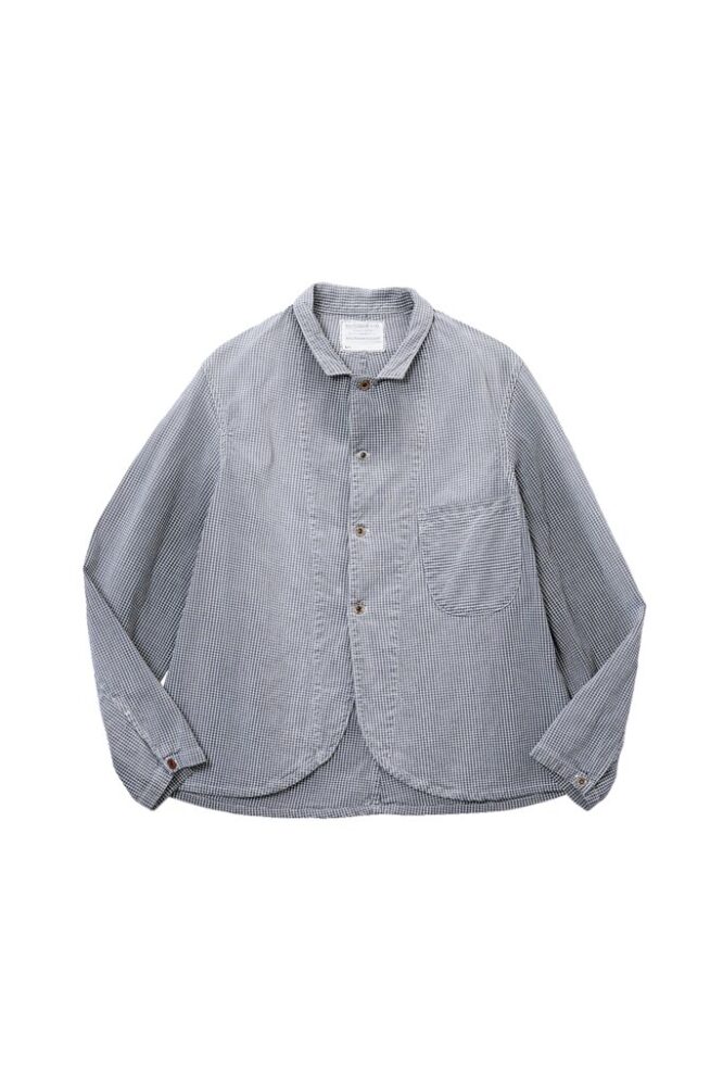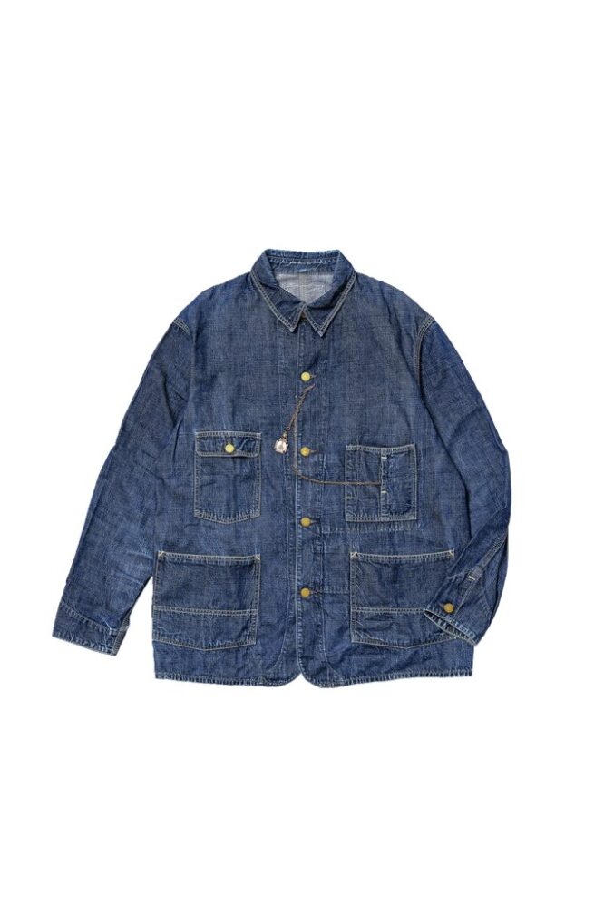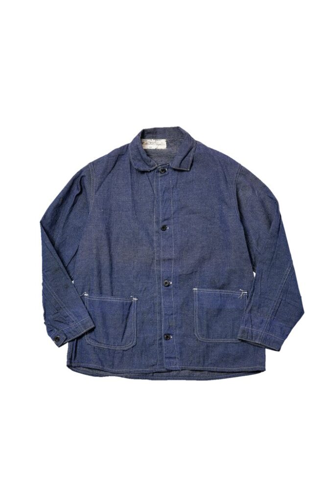 広大なアメリカ大陸に鉄道網が敷かれ始めた1910年代のサックジャケット。ブラックのドーナツボタンやデニムの表情など、1800年代のサックコートに比べてもかなりカジュアルな印象。シルエットはややゆったりとしたAラインで、胸ポケットはなく、裾にパッチポケットが2つ付く。
