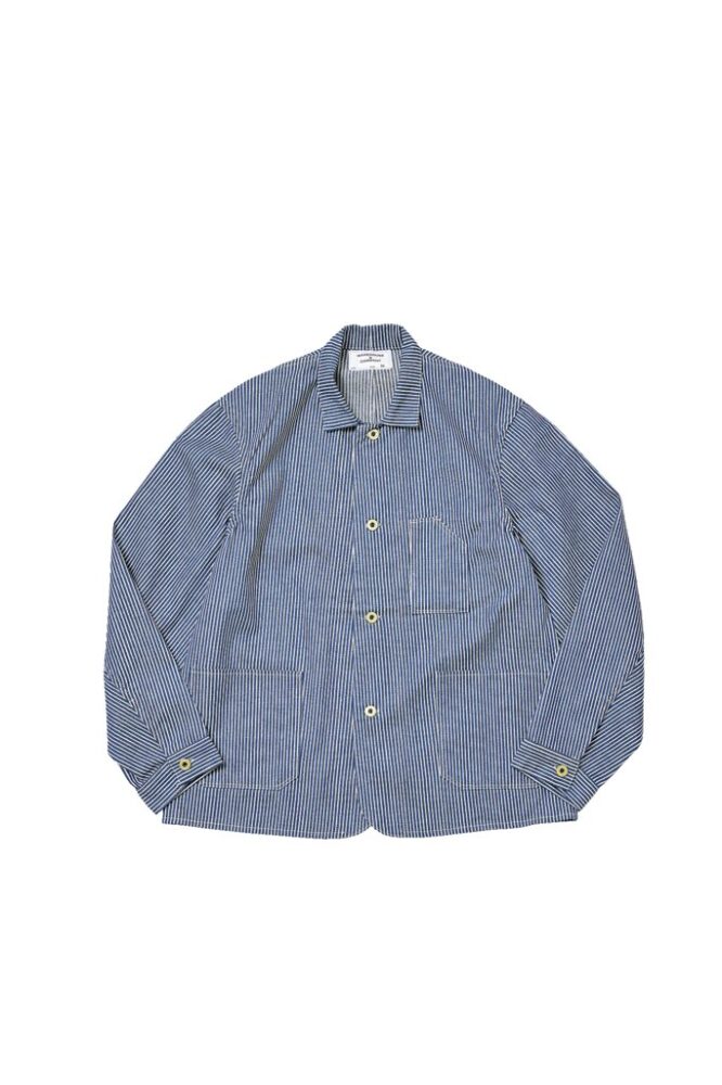 1920年代の鉄道作業員向けに作られたカバーオールをサンプリングした「ウエアハウス」の1着。ワークウエアの代表的な柄であるヒッコリーストライプや左胸に配置された“変形ポケット”など、現代において多くの人がイメージするカバーオールのデザインが見て取れるように。