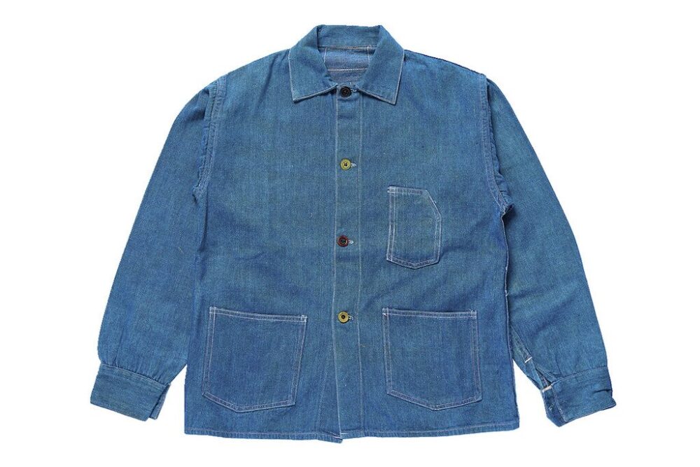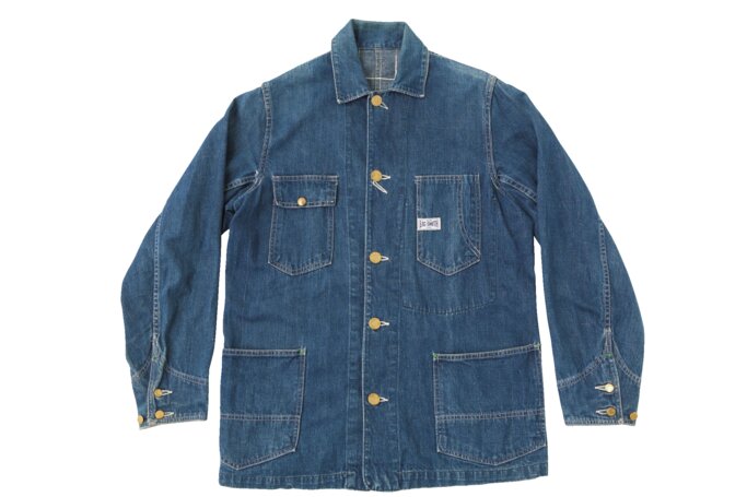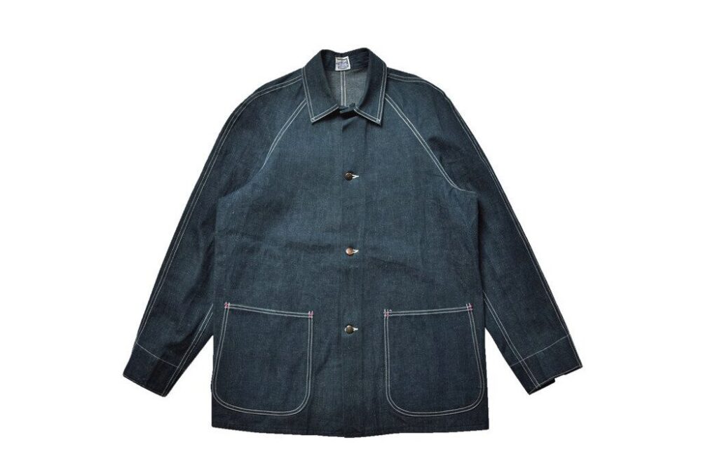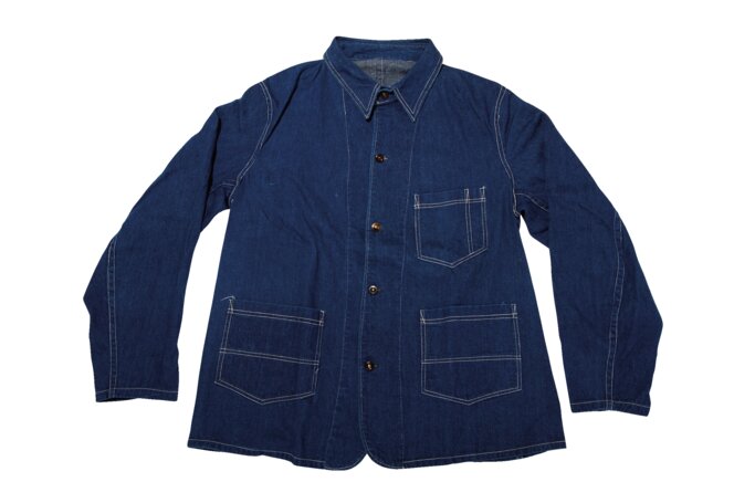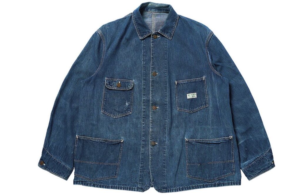 上の写真は戦前のデニムカバーオール。平置きにすると肩幅よりも裾幅が広いAラインのシルエットであることがわかる。まだカバーオールがテーラードジャケットの延長線上に存在していたことがわかる。