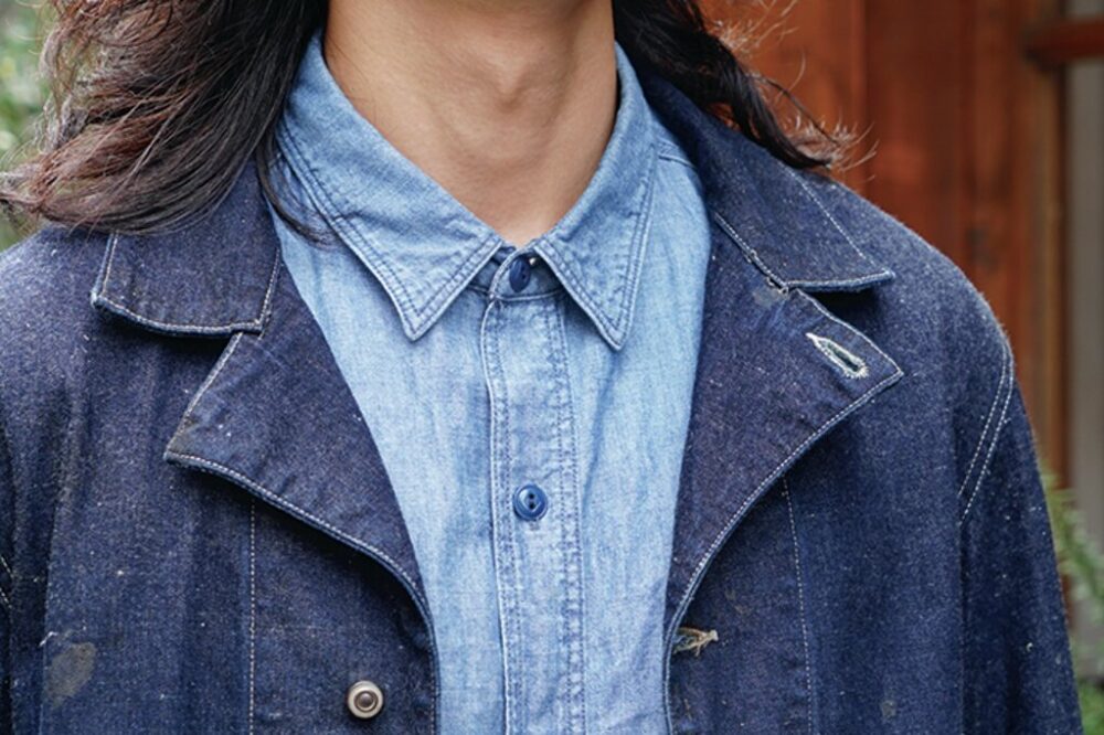 インナーに合わせているシャンブレーのワークシャツもBSCユニフォームとして製作したもの。デニムとの相性も抜群だ。