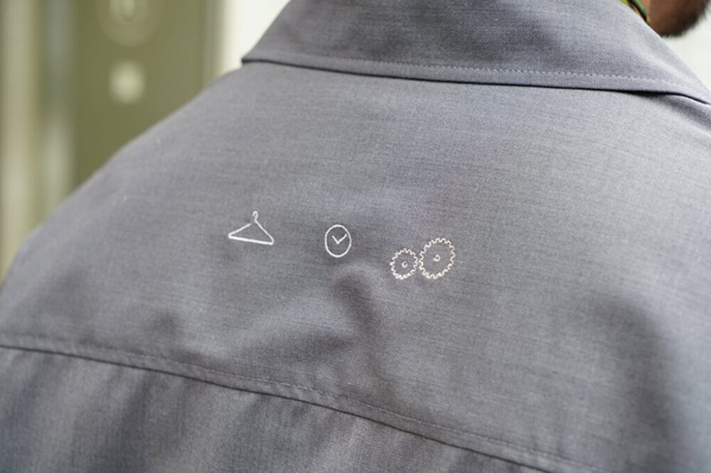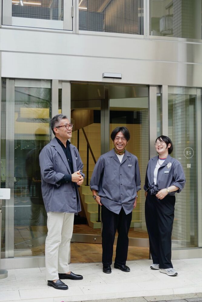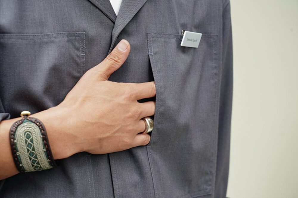 動きやすさを実現するために、あえて大きめのシルエットに仕上げているが、タックインして着用すれば、上品な着こなしも可能。接客から時計修理まで対応できるこの絶妙な身幅になっている。