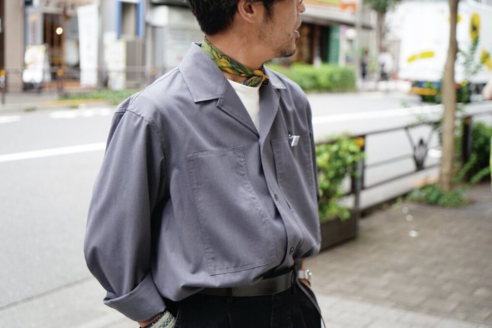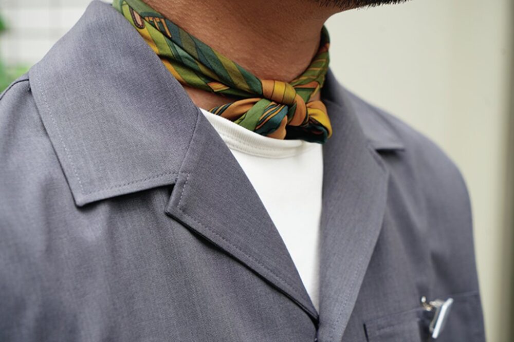 オープンカラーの襟元は、様々な着こなしが可能。この日の江口さんは、シンプルなクルーネックのTシャツに、シルクのスカーフをコーディネイトする。