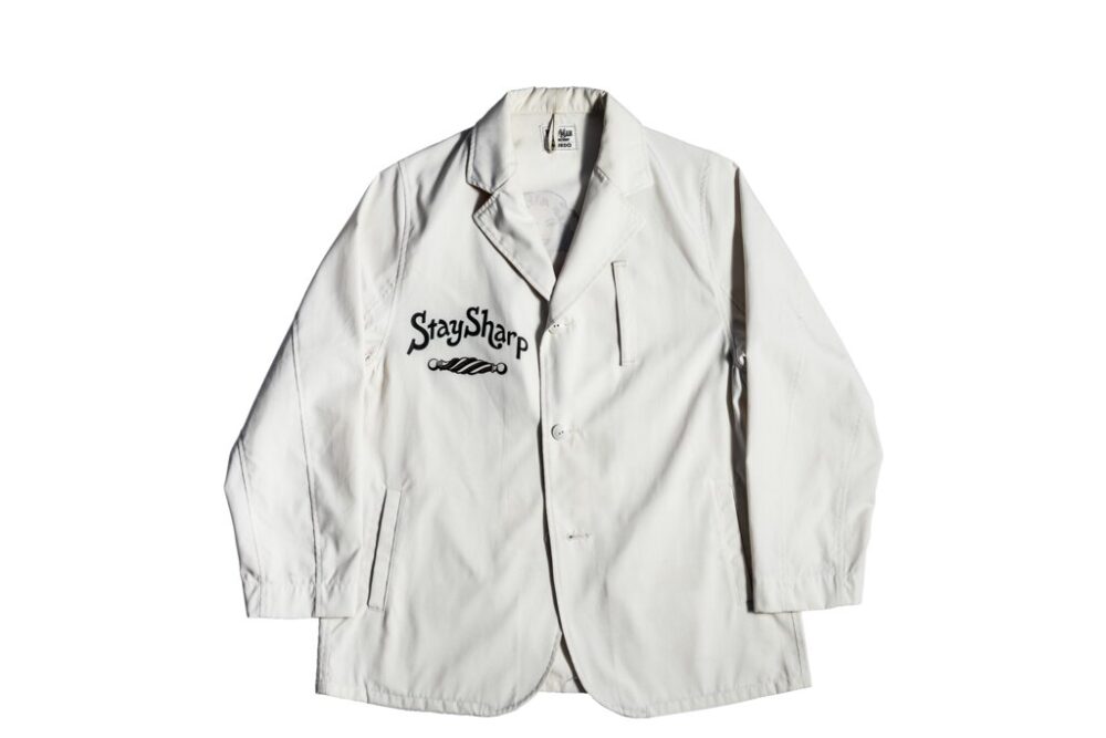 胸にはカット中に必要なツールを引っ掛けられるように配慮。シンプルな3つ釦のワークジャケットをベースに、バーバー仕様に改良されている。