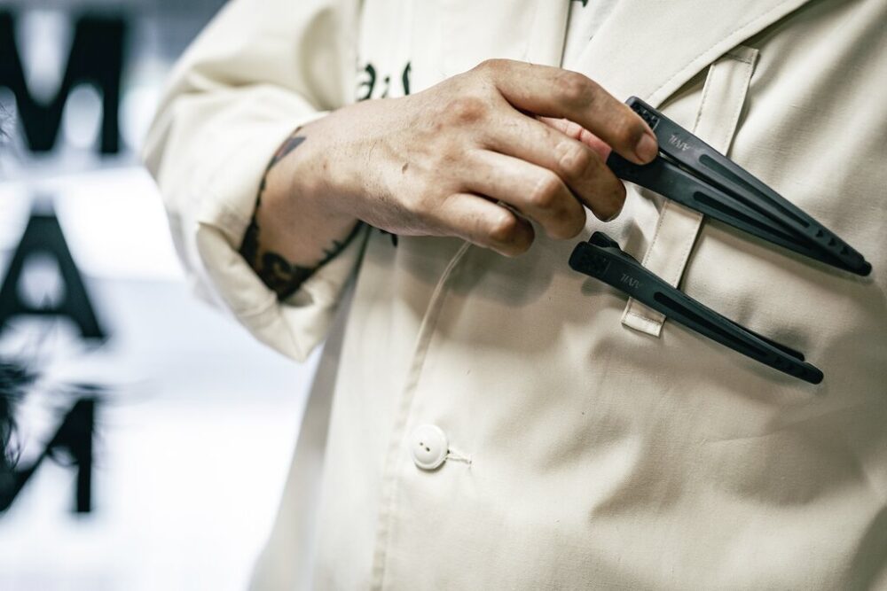 「既製品で機能性やデザイン性で納得できるものがなかったので、それなら自分で作ってしまおうというシンプルな理由です。カバーオールに関しては、カットした時に付着する髪の毛が払いやすく、撥水性に優れた生地を選びました。また腕の上げ下げをしやすようにパターンから作り、見た目だけでなく、タフで動きやすいというユニフォームの本質をしっかりと追求しました。