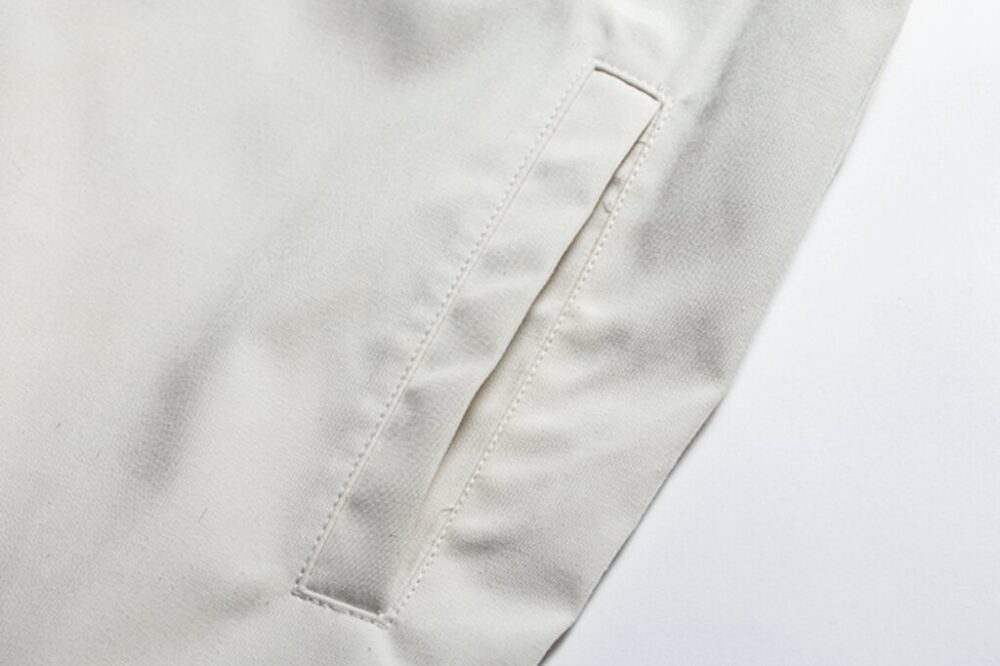 ポケットは、切った髪の毛が入ってこないように、パッチポケットではなく、スラッシュポケットにアレンジされている。生地は撥水性のあるポリコットンをチョイスして、切った髪の毛が払いやすくなっている。