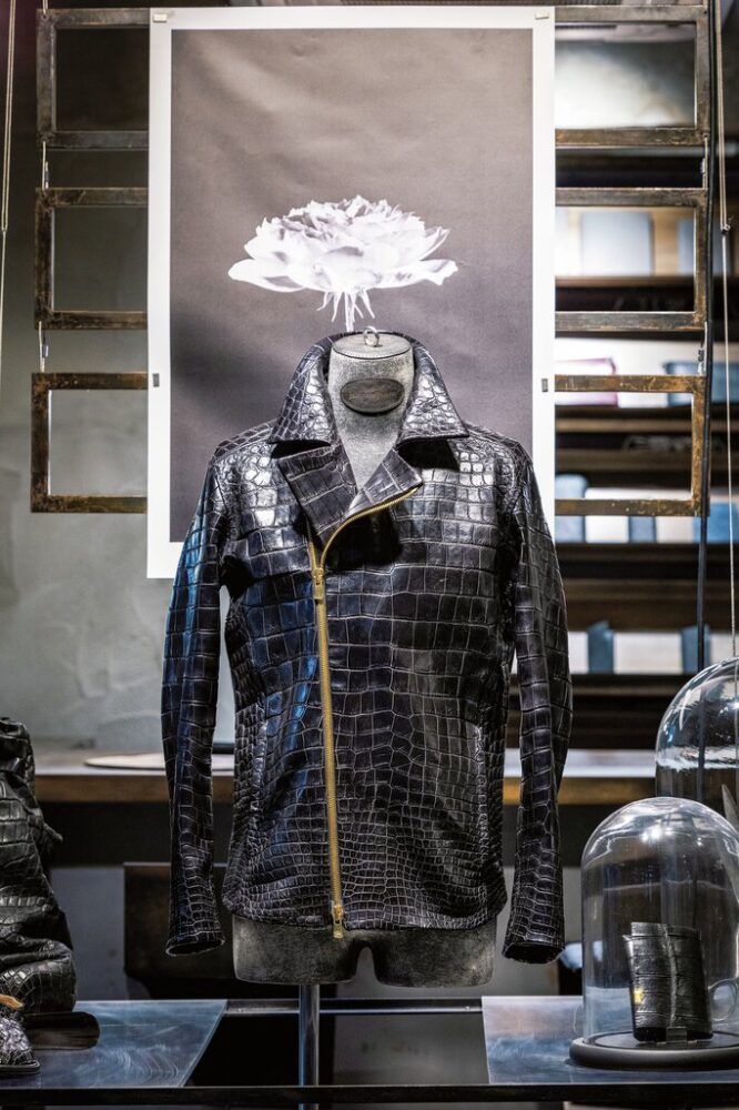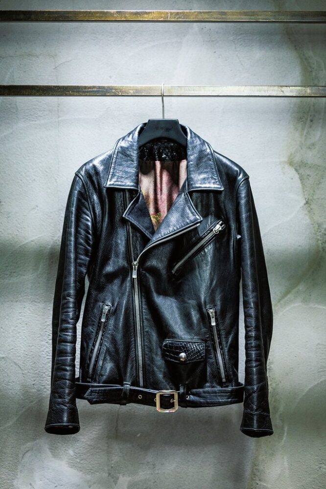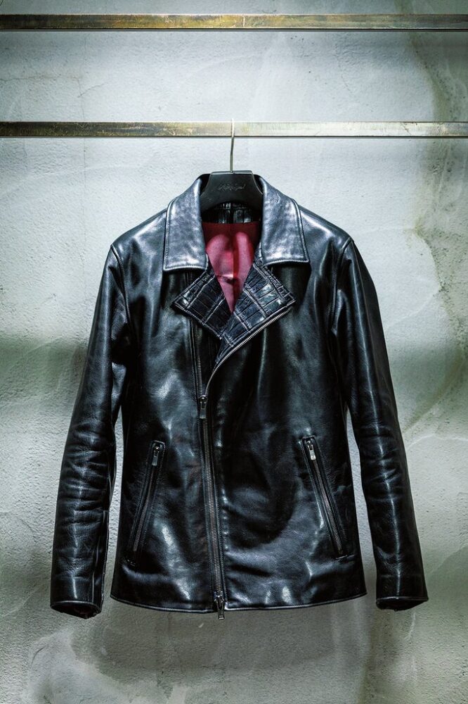 ダブルライダースをベースにラペルの内側のみクロコダイルを当てがった大人のカスタム。エレガントな雰囲気になる。