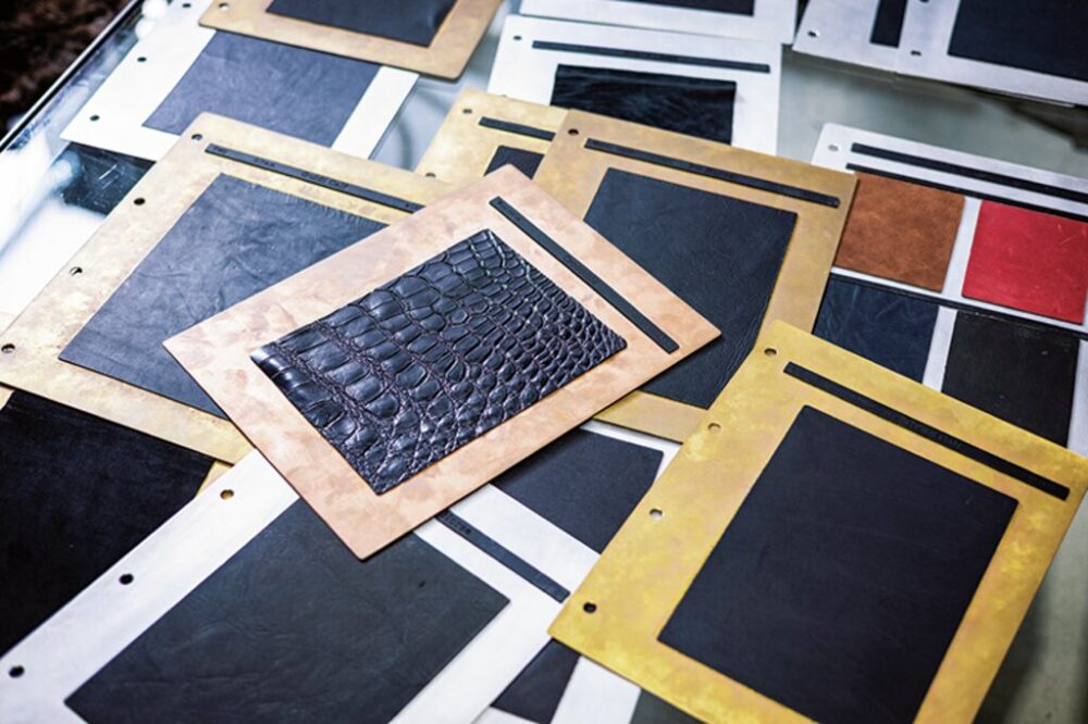 革ジャン選びの超重要事項、革も自分で選ぶことができる。しかも、牛/馬/羊/クロコダイルなど、オプション含め全16種類から。スムースレザーやスウェードも展開している。