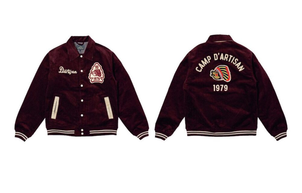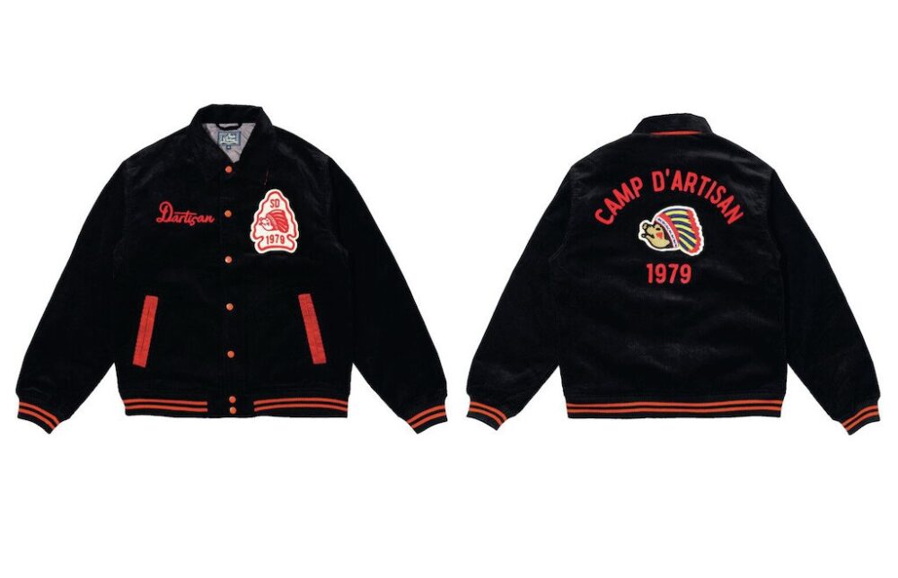 中綿のキルティング裏地が付いた、保温性の高いコーデュロイスタジアムジャケット。1950年代のスタジアムジャケットをデザインベースにしており、背面はレトロなチェーン刺繍と相良刺繍でインディアンを描いたフェルトパッチを組み合わせた、ヴィンテージライクな一着。