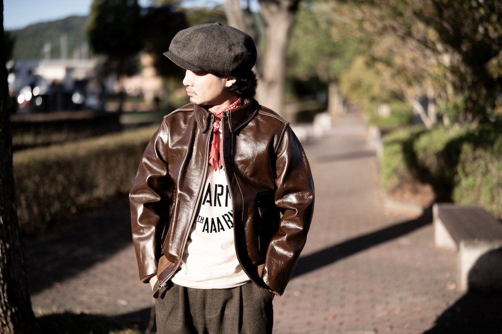 A-2のコントラクターでも生産性のある工場背景を持っていたラフウェア社のA-2は計5回の納入実績があるが、これは同社が生産した1942年契約の4番目を再現。台襟付きの大きな襟や、この年の途中から“プロパティー・エアフォース”表記を義務付けしたため、2段ラベルが特徴となっている。素材はイタリア原産のホースハイド。シールブラウンのアニリン染料で染め、ラッカーで仕上げている。23万1000円