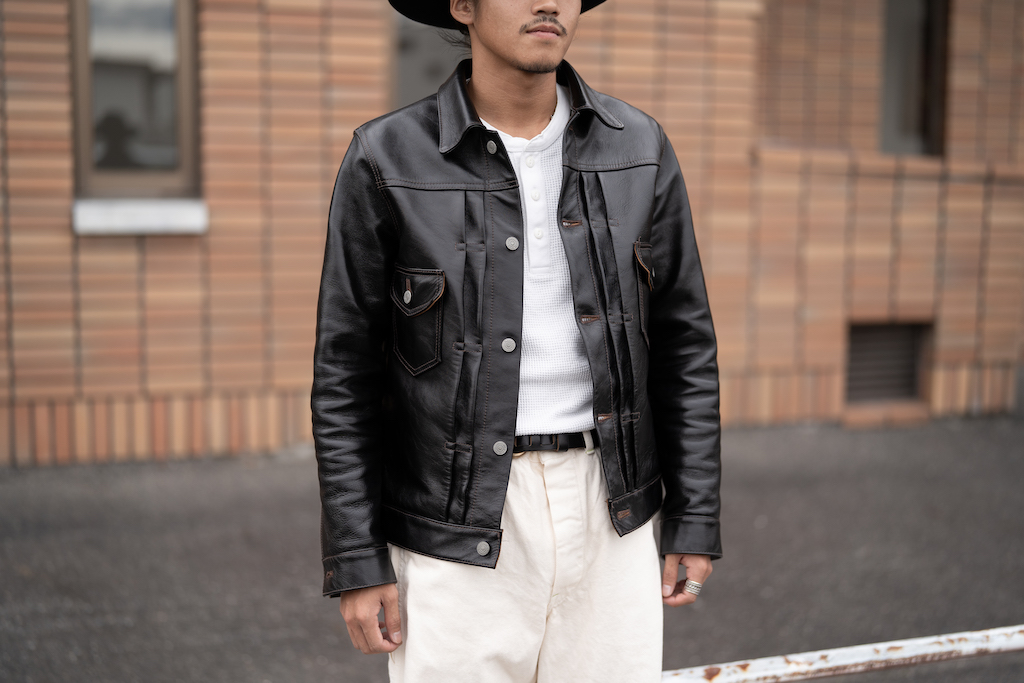 セカンドジェネレーションのデニムジャケットをホースハイドでデザインしたモデル。といってもヴィンテージをそのままトレースするのではなく、フロントポケットは直線と角度の調整で細部にわたり独自のデザインでモディファイすることですっきりとした見た目に。ボタンはダブルヘリックスのロゴを刻印したオリジナルパーツを採用している。15万4000円