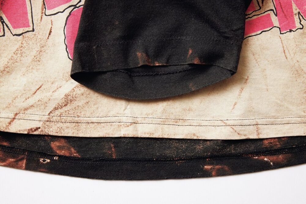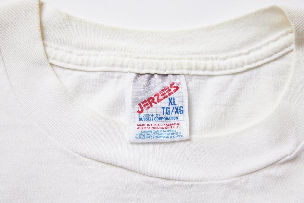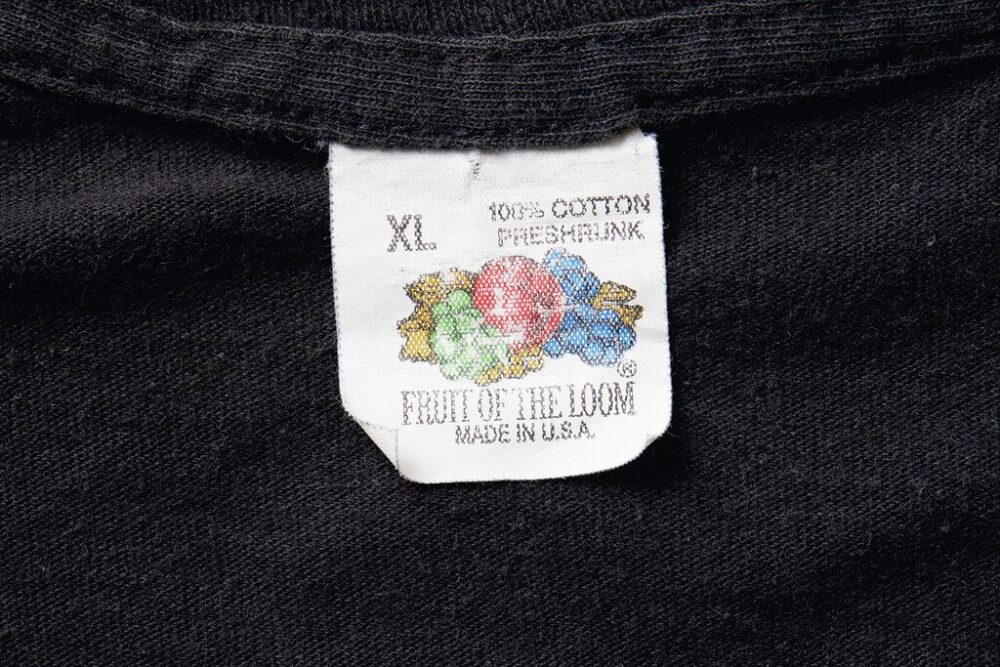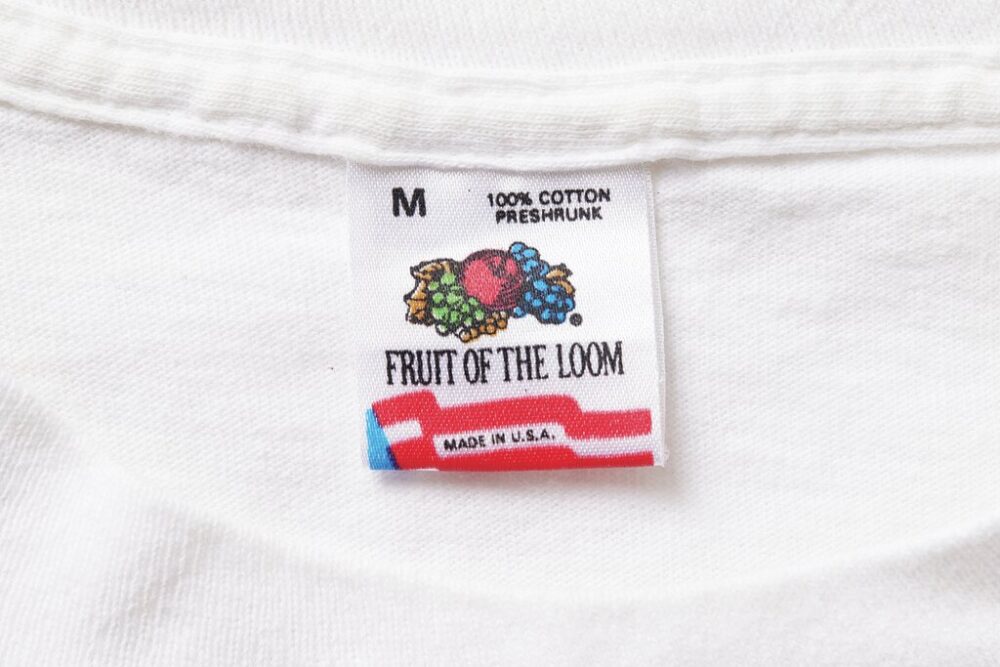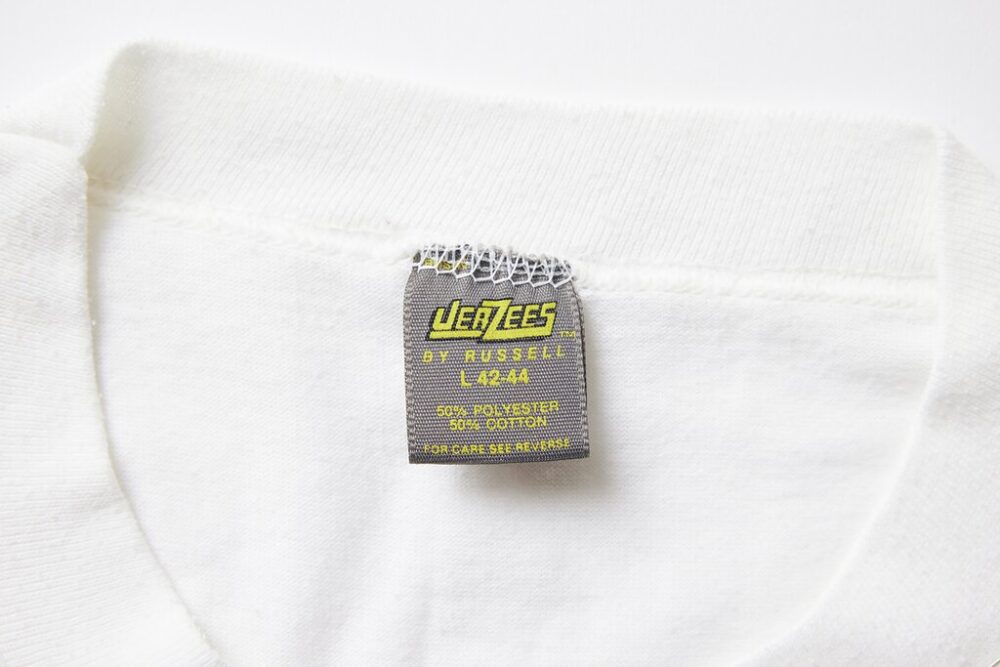 Tシャツの素材も年代ごとに特徴がある。写真上のタグにはポリエステル50%、コットン50%と記載があるが、割合が1:1綿ポリは比較的’80年代のものが多く、90年代はコットン100%が多い。