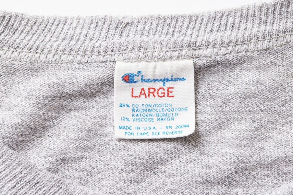 タグは年代判別をする上でとても重要だ。ここではデザインではなくタグの素材や形の変遷について見ていく。’80年代後半までは、1枚で薄いタグが付いていることが多く、’90年代に入ると縦に長いタグを折り返して縫うようなタグに変わり、これまでよりも厚くしっかりとした素材になる。’90年代後半になると、ブランドロゴと素材表記が別々にプリントされた2枚のタグが付くようになる。メーカーによって多少の違いはあるがタグからある程度の年代判別は可能だ。