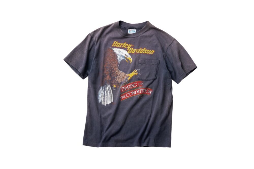 言わずと知れたアメリカを代表するバイクメーカー「ハーレーダビットソン」のプリントTシャツ。同メーカーのアイコンであるハクトウワシが大きくプリントされた迫力のある1枚。90年代頃のアメリカ製で、着用や洗濯、それに日焼けによってフェードしたボディはヴィンテージならではの風合い。