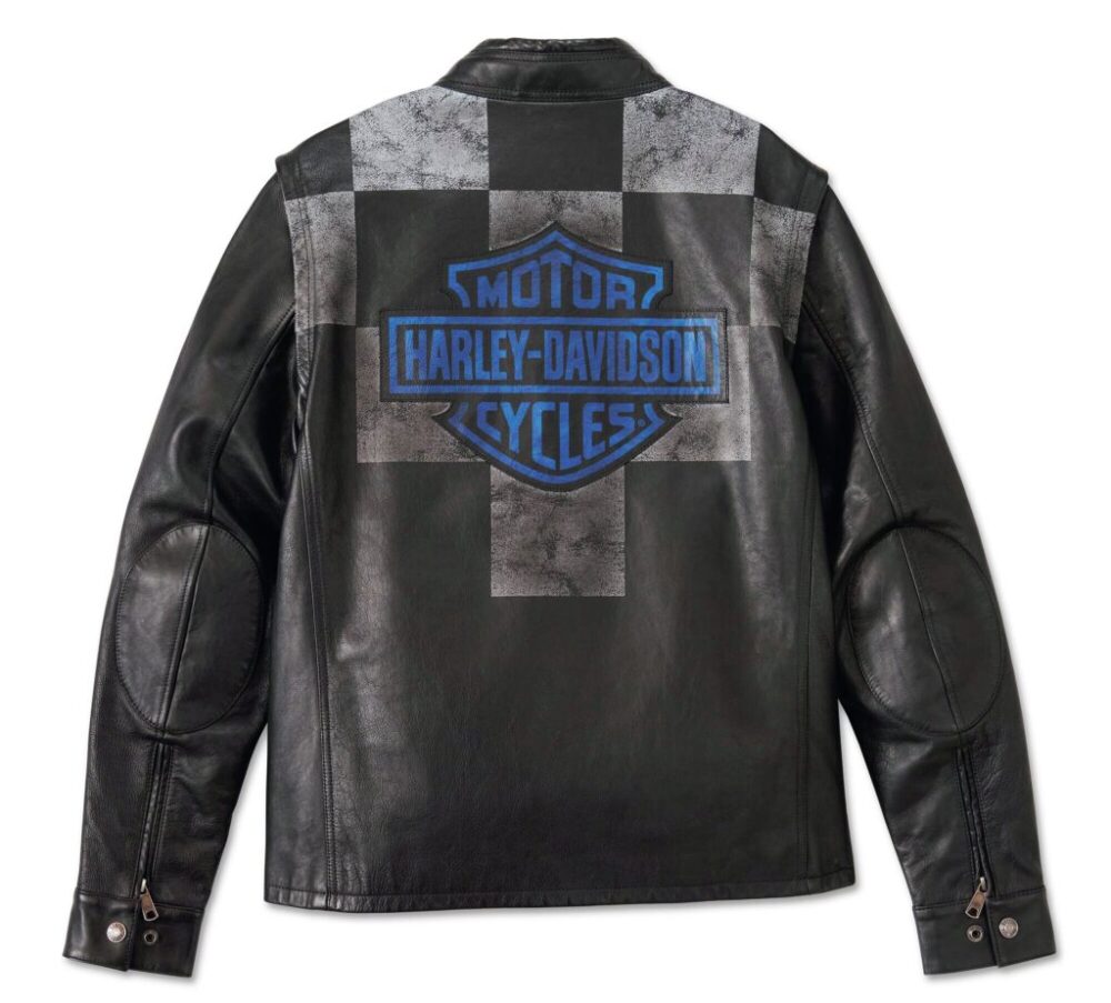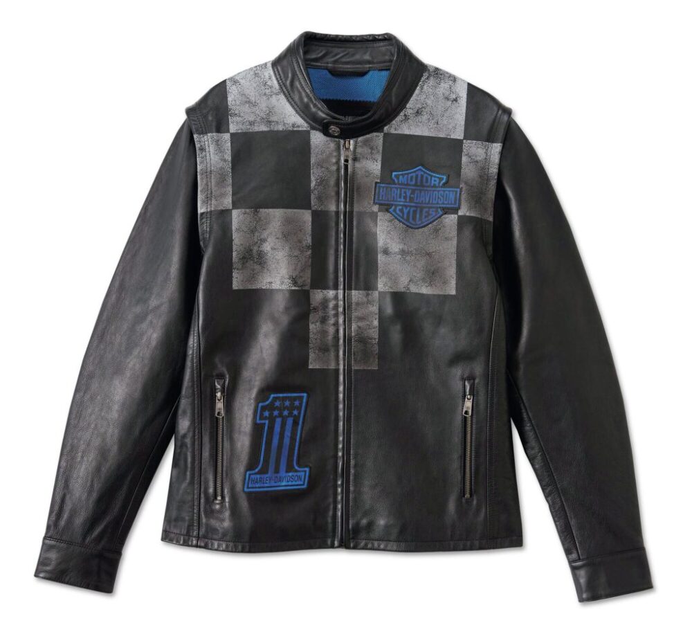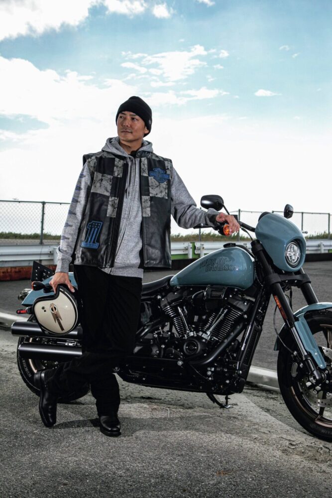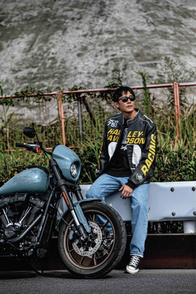 ナンバーワンマークとバー&シールドが刺しゅうされたジャケットは、身ごろにかすれたチェッカー柄をプリントすることでヴィンテージ感を演出。また、このジャケットはソデを取り外すことができ、ベストのような着方も可能。そこにパーカを合わせることでソデのプリントがより強調される。ベストを加えることで、スピードクルーザーであるローライダーSのスタイリングにマッチする着こなしとなっている。