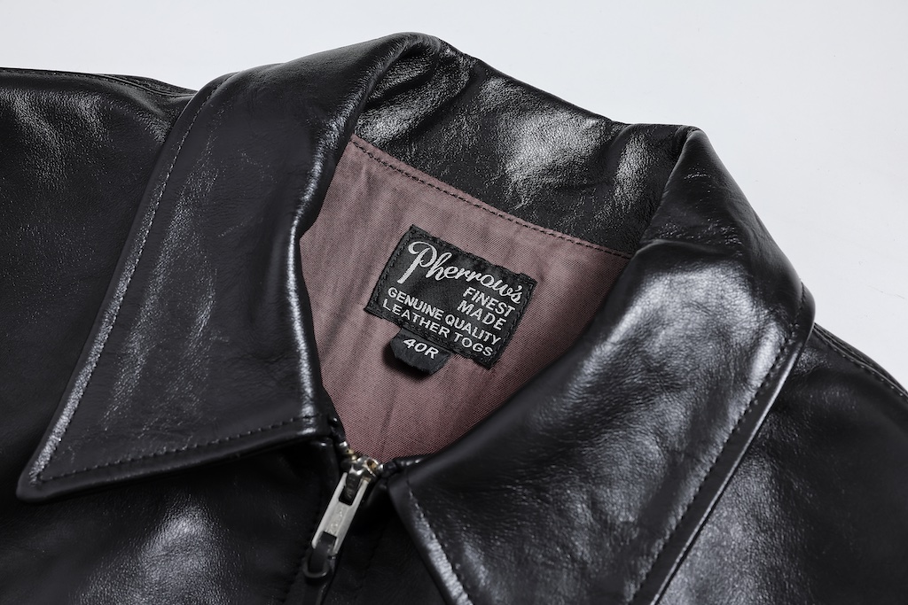1930年頃のヴィンテージスポーツジャケットをベースにしたレザージャケット。時間をかけ丁寧にタンニン鞣しにて仕上げられたホースハイドをピグメント処理によって表面強度を高め、さらにワックスオイルを含ませることで当たり皺を残しやすくした特殊加工を施こすことで、一般的なホースハイドと比較して早く関節跡が残りやすくなり、長年着込んだかのような風合いを演出することができる。フロントはシングル仕立て、胸ポケットのボールチェーンや背面のアクションプリーツなど、クラシカルに仕上がっている。19万8000円(フェローズ TEL03-5725-9577 http://www.pherrows.com)