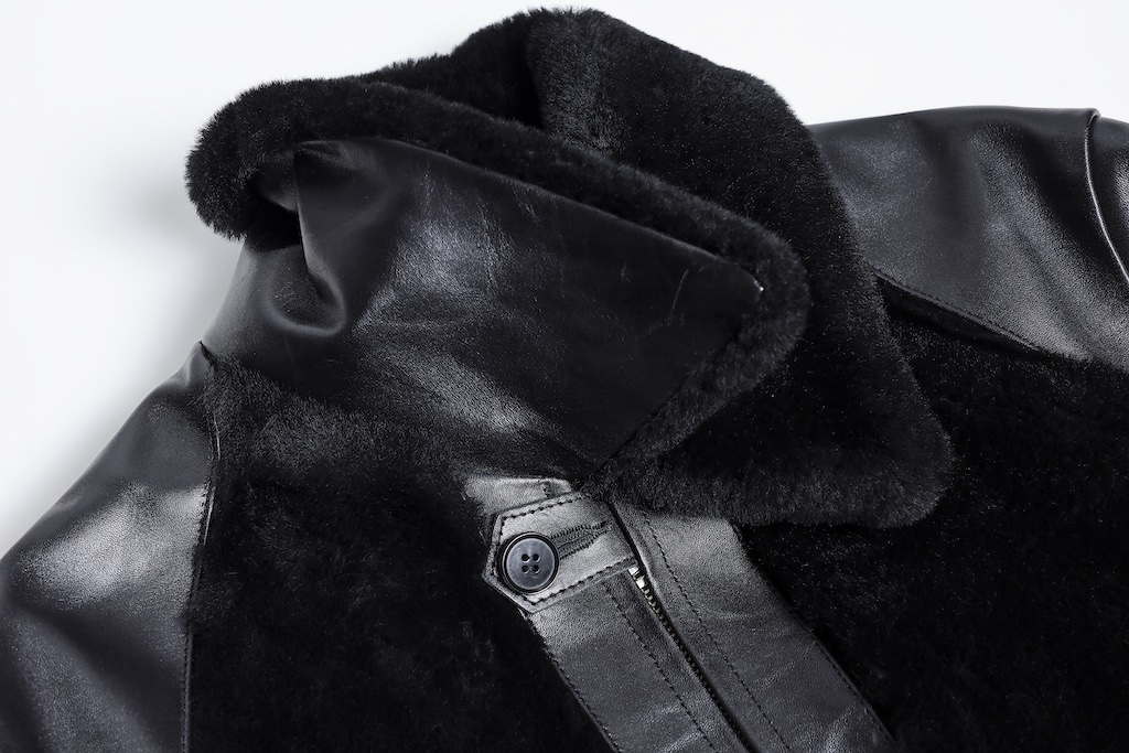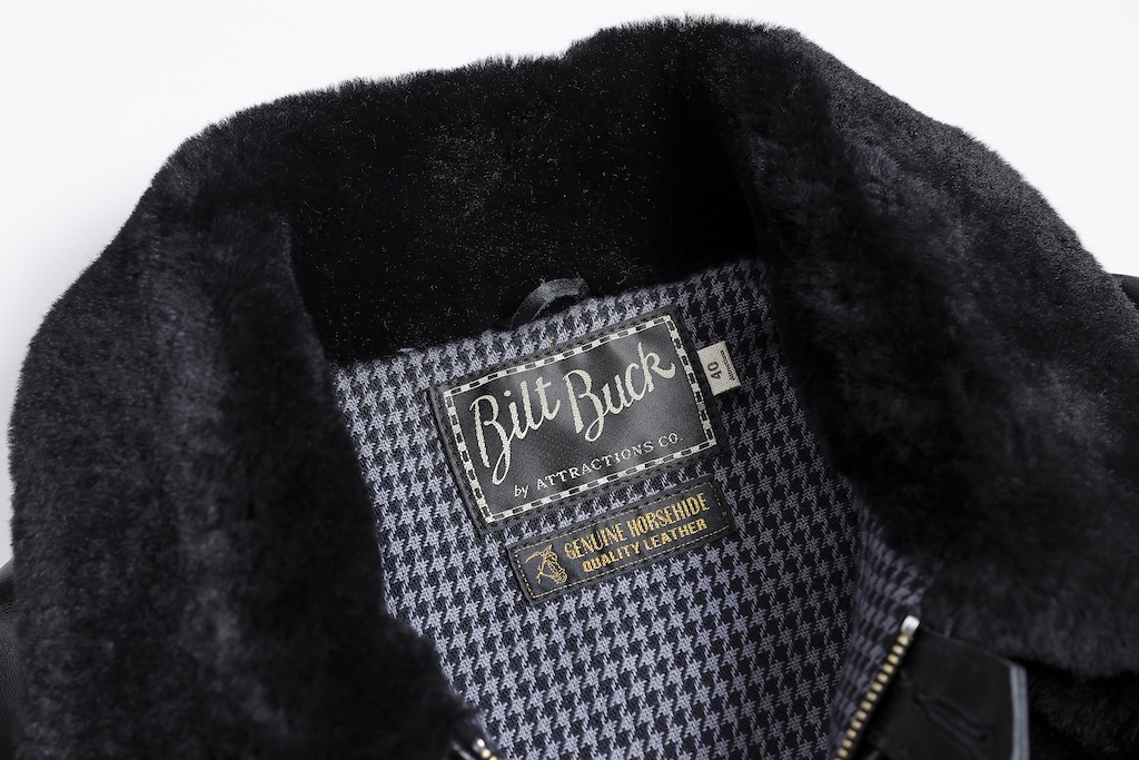 2013年の発売から10年の節目を超えたビルトバックの代表作。レザー&ヴィンテージファン垂涎のスペシャルと言われる1930年代のグリズリージャケットをベースに、ラッカーフィニッシュのフルベジタブルタンニング・ホースハイドに美しい毛並みのリアルシープムートンを前面、背面、襟と惜しみなく使用した豪華絢爛なジャケット。ライニングは千鳥格子のコットンライニングでクラシカルさを演出。そのほかベリリウム素材のオリジナルフロントバックル。コ字ハトメエンドのWALDESファスナーなど、語りたくなるクラシカルなディテールばかりだ。27万5000円(アトラクションズ TEL03-3408-0036 https://attractions.co.jp/)