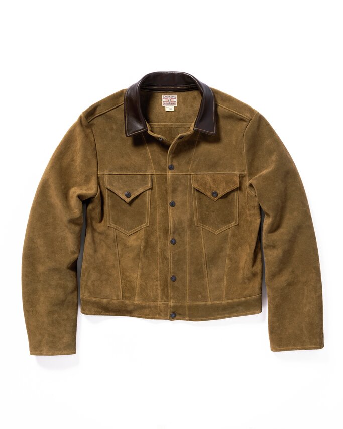 柔らかなカウハイドのスプリットレザーで作られたウエスタンジャケット。表革で切り返した襟、カフスのない袖口などは1960年代のカウボーイ向けに生まれたレザージャケットのディテールを踏襲している。15万4000円