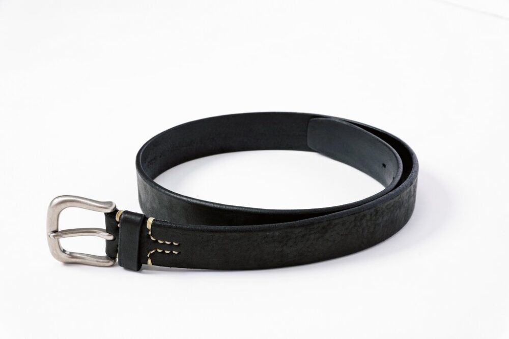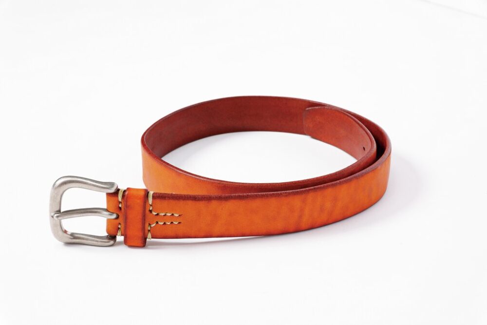 繊維が細かく密度の高いべンズレザーを使用。凹凸のあるフルグレインレザーの表情に加え、裁断後に一本ずつ染色し、オイルを入れて磨き上げることによる武骨ながら上品な仕上がりになっている。2万4200円