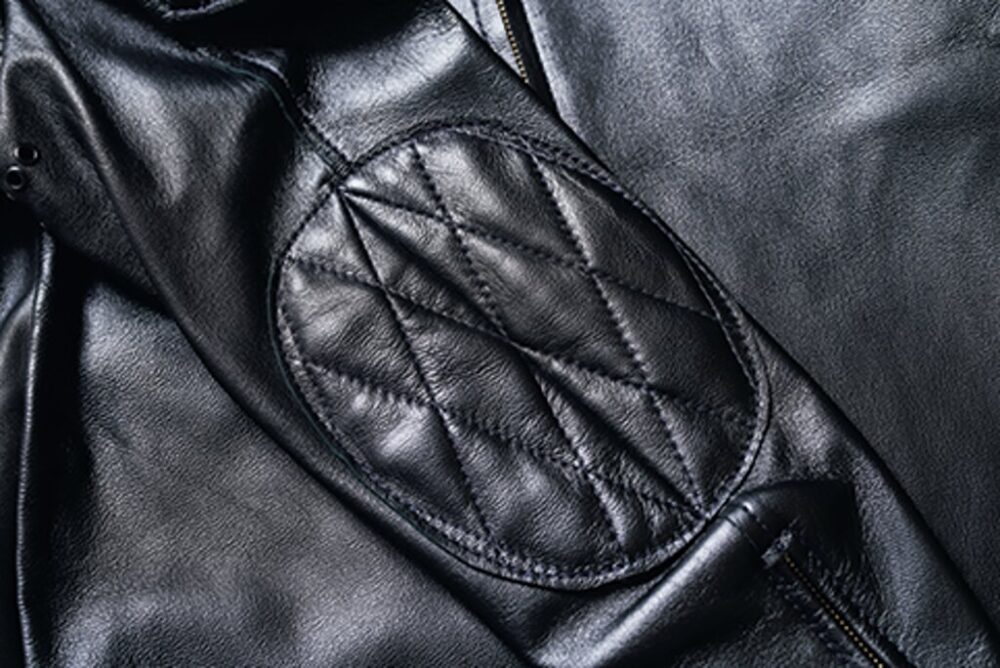 転倒時に身体を守ってくれるように肩や肘にパッドがデザインされるタイプも珍しくない。カラダをむき出しで乗るバイク乗りならではのディテール。極限のスピードを競うレース用のライダースジャケットではパッドは必須になる。