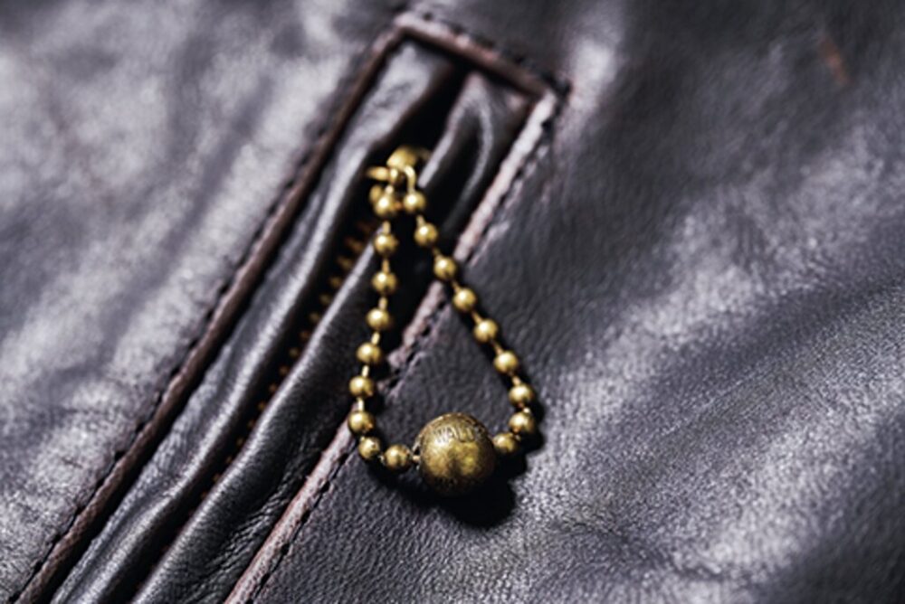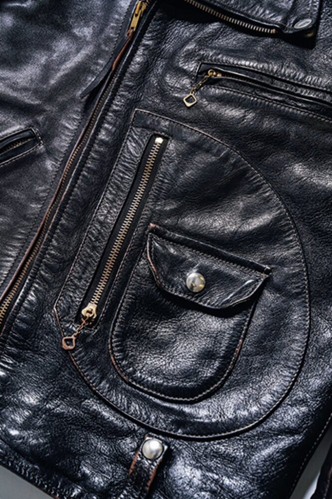 D型のフロントポケット、通称Dポケットは1940〜1950年代のアメリカのライダースジャケットによく見られたディテール。地図やタバコを入れ、ライディング時にも取り出しやすいように考案されたデザイン。ポケットの中身が出ないようにジッパー式ポケットになっているのもバイクに乗ることを想定した仕様になっている。