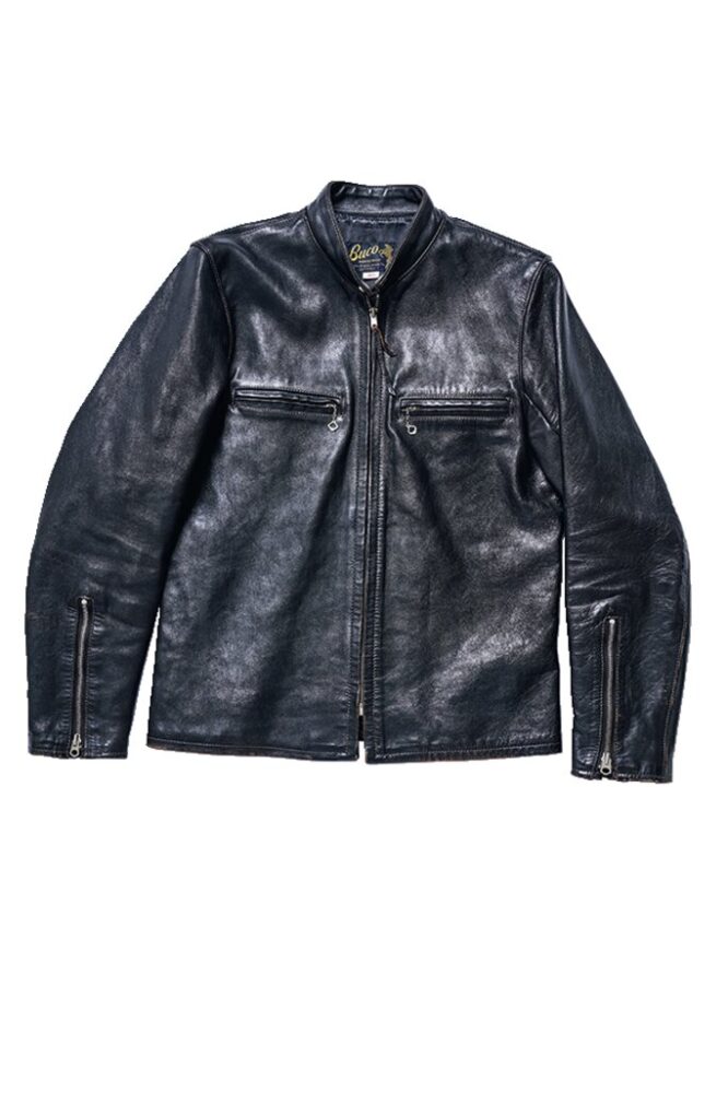 レース用のモーターサイクルスーツのツナギの上半身部分を独立させたことにルーツがあるといわれているシンプルなスタイル。小さなスタンドカラーはヘルメットを装着しても邪魔にならないように設計したため。シンプルながらレーシーな雰囲気が特徴。カフェレーサージャケットとも呼ばれる。