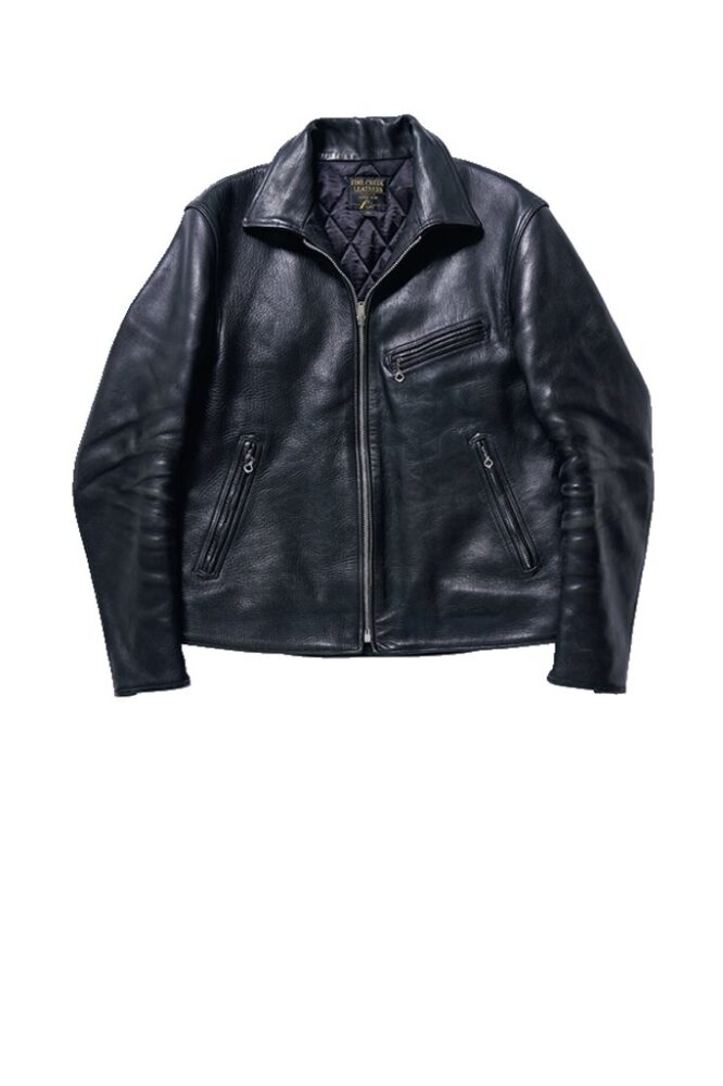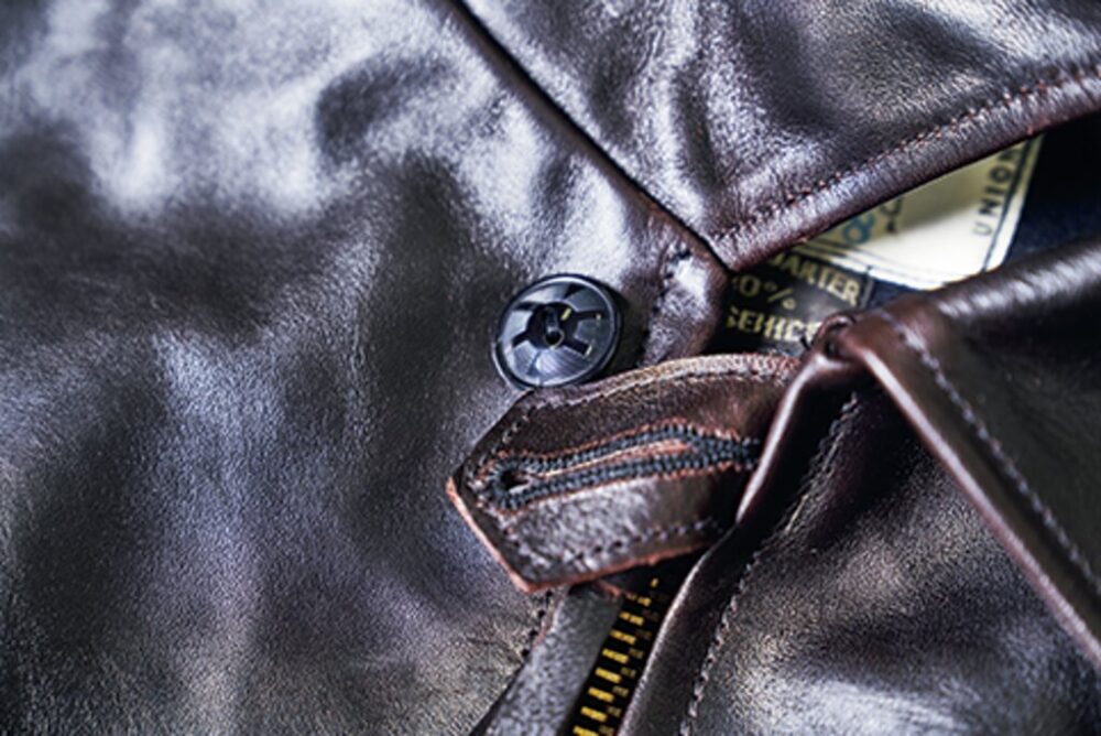 襟があることでカジュアルな雰囲気になる襟付きシングルタイプ。襟が付くことで競技用ユニフォームというイメージが薄くなるので、普段のコーディネイトにも比較的取り入れやすく、革ジャン初心者にもおすすめのデザイン。