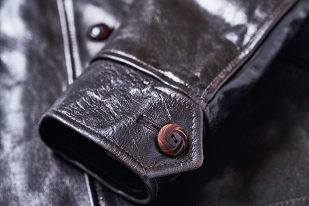 エポレットやウエストベルトなどは無く、シンプルなイメージのシングルタイプ。ファッションとしてもシンプルなレザージャケットを好む人におすすめのデザイン。写真のモデルは袖口がカフスでは無くリブ仕様になっている。
