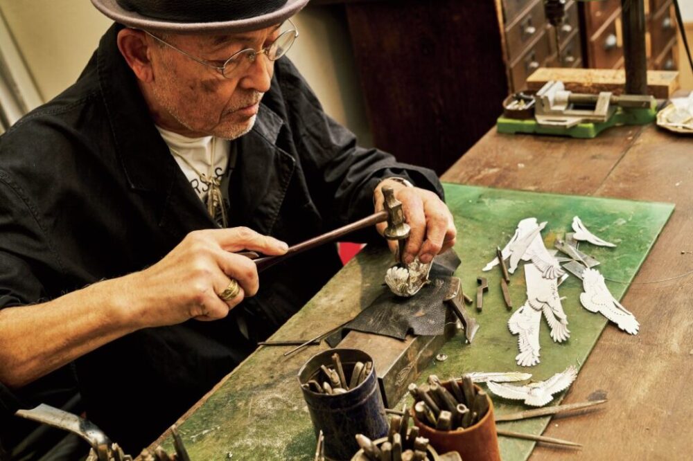 そんな彼が上京するのは18歳の時。東京の青山セントラルビルに、住居兼アトリエを構えた。そこには、後に日本を代表することとなるアーティストやデザイナーなどが集まっていた。中でも印象的だったのは、後のゴローズの創業者、高橋吾郎氏だったという。