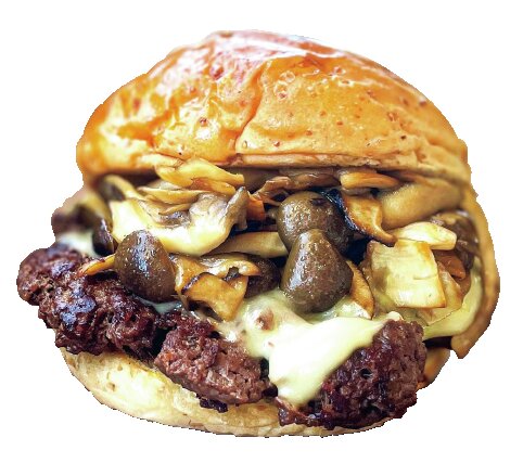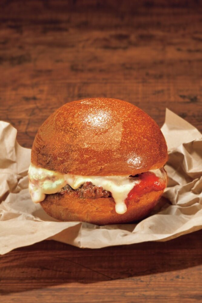 国産牛100%パティをスマッシュして焼いたバーガー。焦がし醤油きのこバーガーは必食!(1200円)