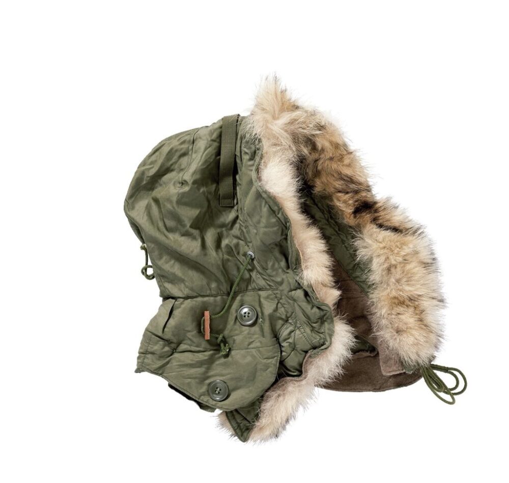 コットンナイロンのシェルにウールの内張り、コヨーテファートリムが施された別体式フード。これはM-51フィールドジャケットにも装着可能である。