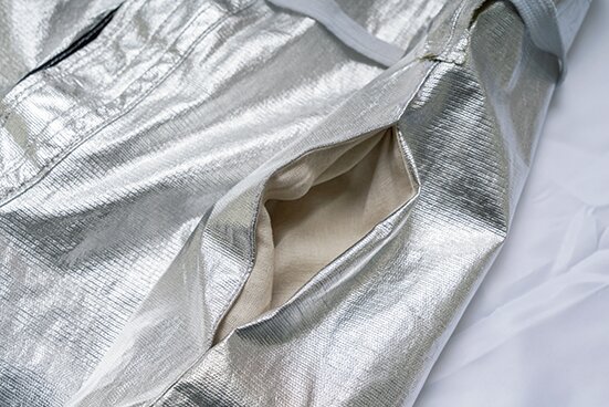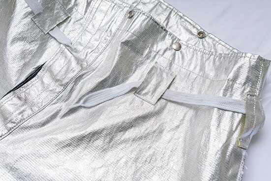 なんともインパクトのあるパンツは、米軍のファイヤーマンに支給されていたもの。防火性のあるパラアラミドを用いており、同素材のジャケットも存在する。デイリーユースできるようにベルトループを後付けしているのもおもしろい。内タグから1994年製。参考商品