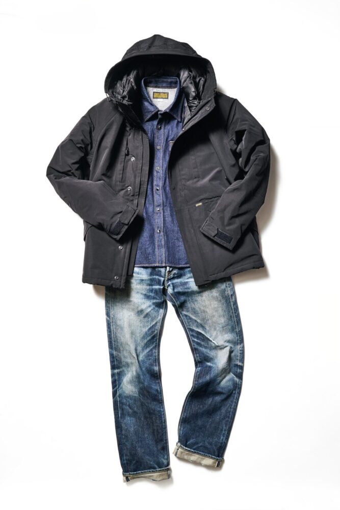 メリハリの効いたエイジングが特徴的な21ozストレートパンツのデニムセットアップに60/40クロスの質感がマッチしたアウトドアテイストを内包するスタイル。タウンユースではオーバースペックと言えるアウターだけに、インナーはデニムシャツだけで極寒地の走行にも十分対応する。