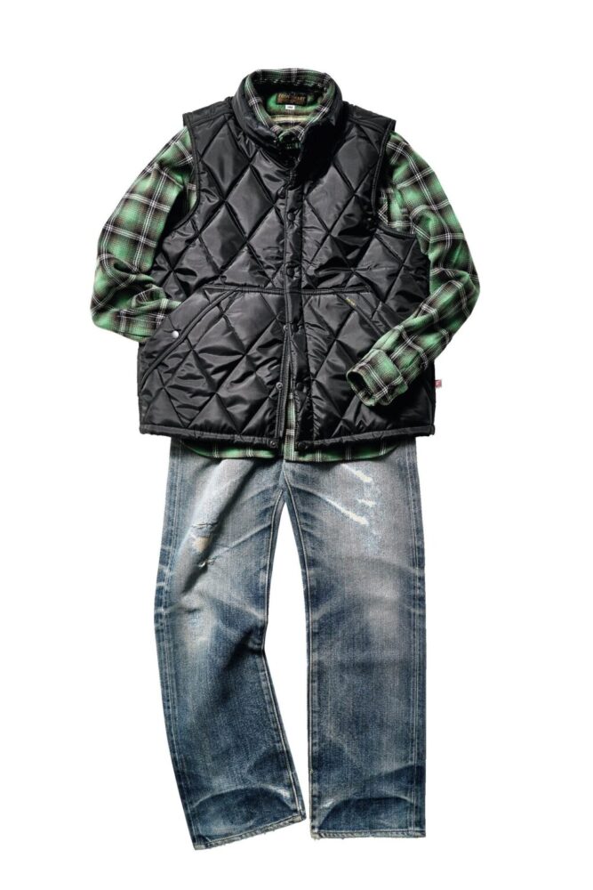 ネルシャツ×5ポケットは春秋不動のアメカジの王道だが、プリマロフトベストをレイヤードすれば防寒性能を満たすバイカースタイルに。昼夜の温度差が激しい秋冬のレイヤードや、真冬のインナーとして、プリマロフトベストがあれば気候に合わせた着こなしの幅がグッと広がる。