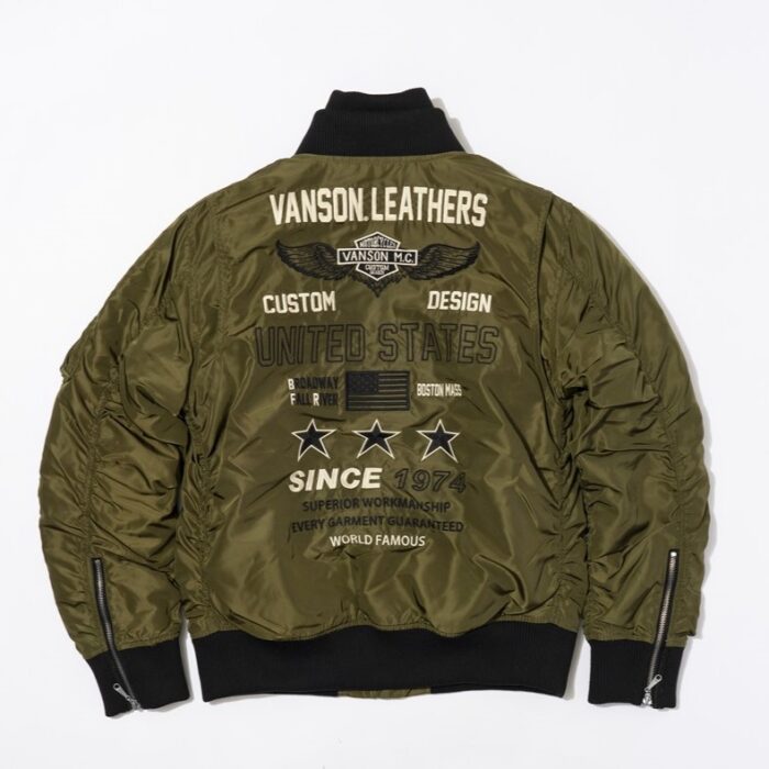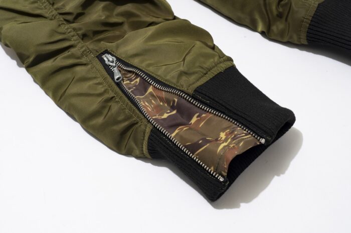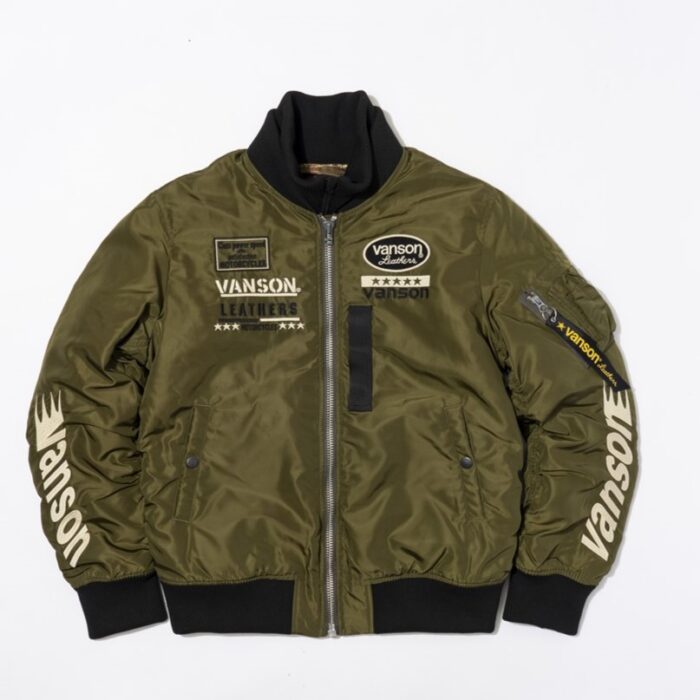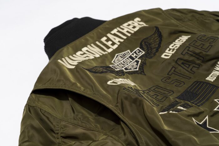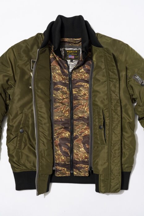 MA-1 をベースにライダース仕様にアレンジ。遮風のための着脱式ダブルフロントや、アクションプリーツ、袖口のジップ仕様などバイクユースに特化。