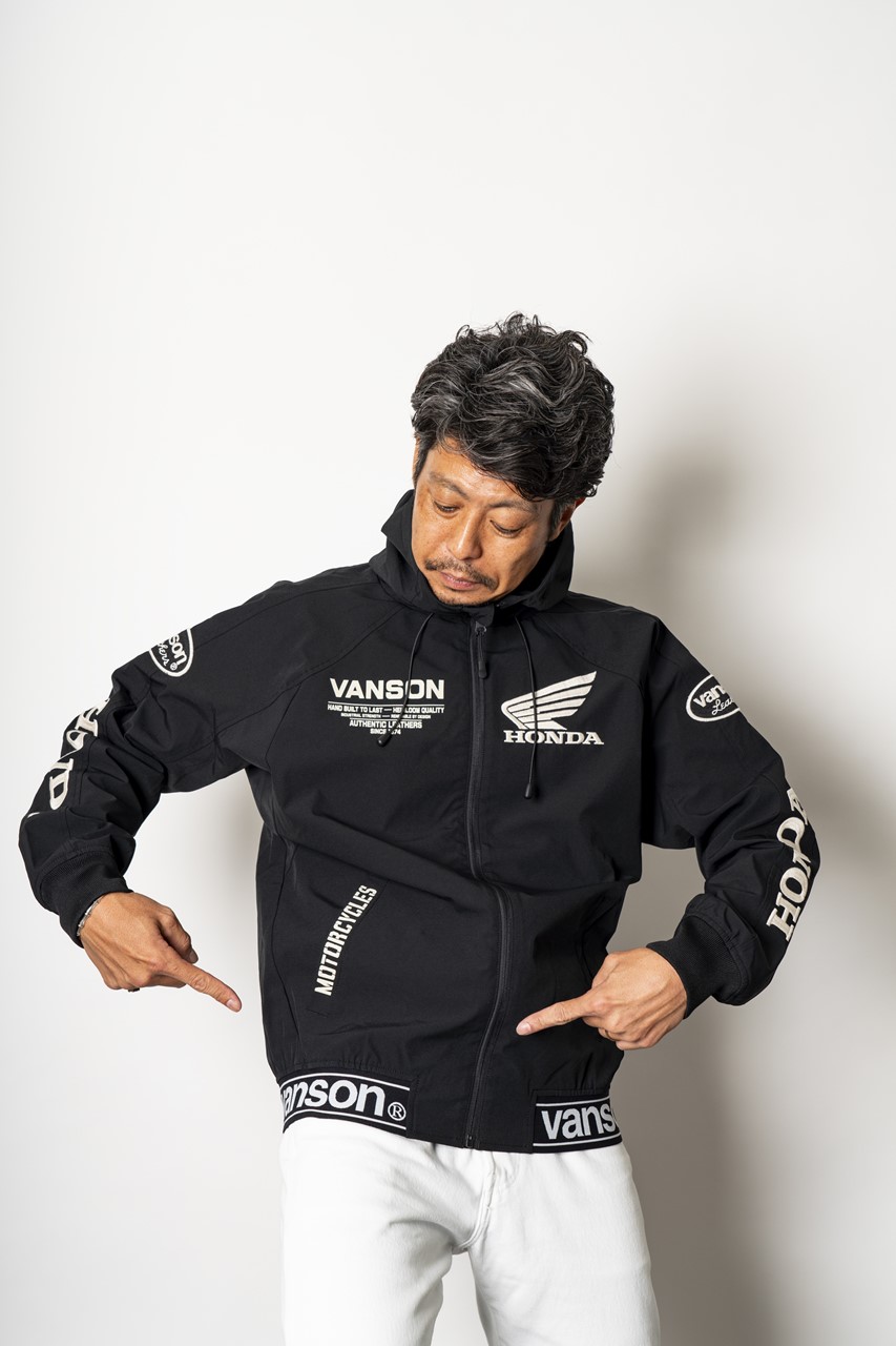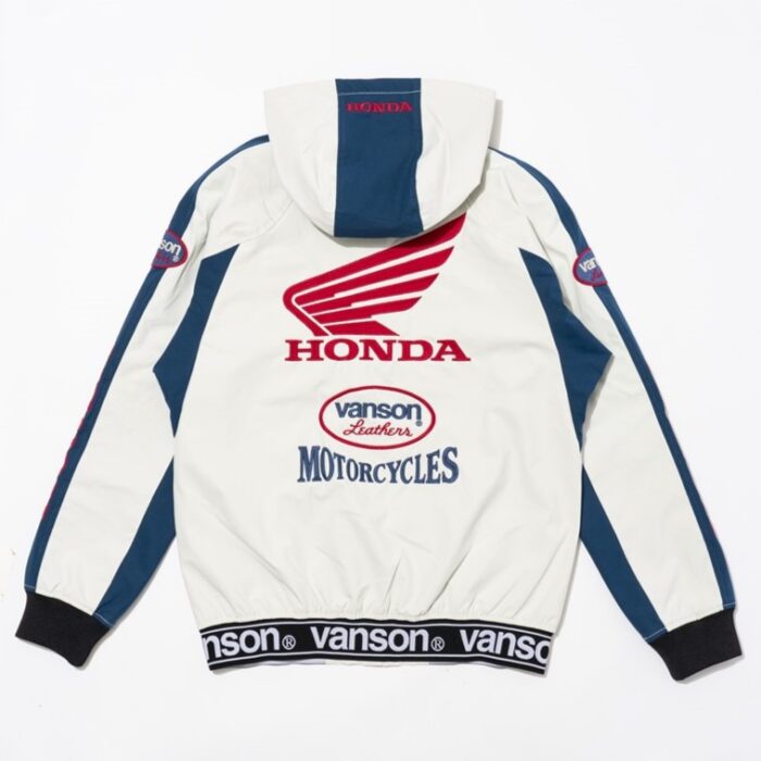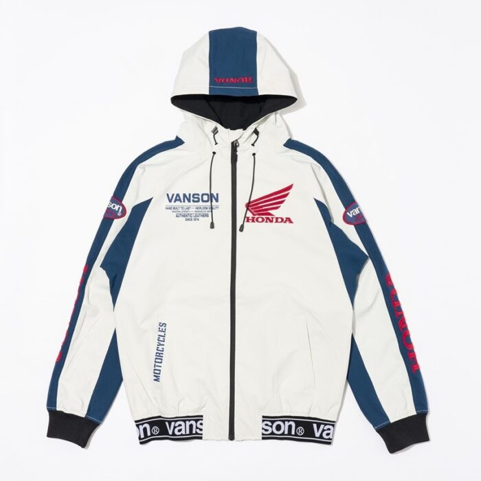高耐水・高撥水加工を施した三層ストレッチ素材を使用したテック系フルジップパーカー。ホンダのウィングロゴを強調したトリコロールデザインは秀逸。雨天に左右されるバイクツーリング時でもこれなら安心である。