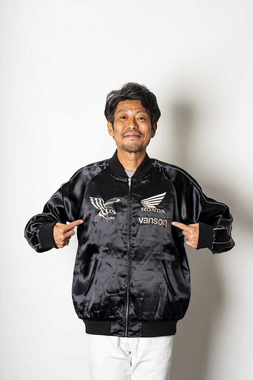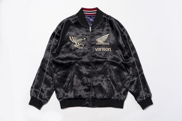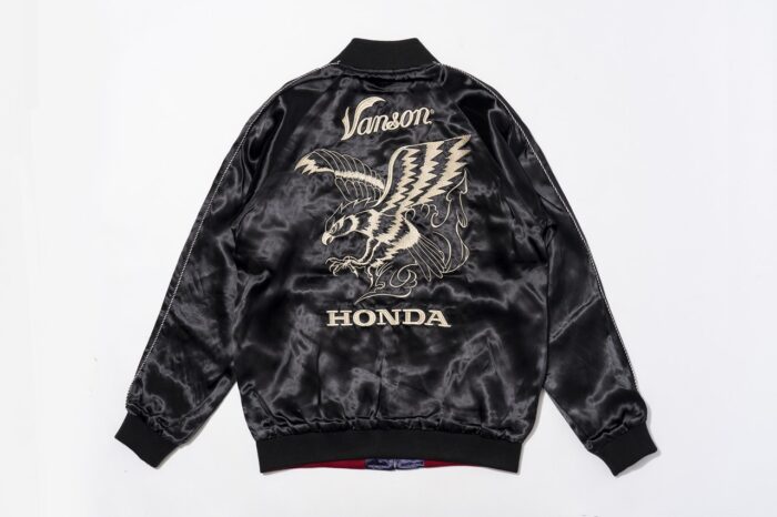 世界に羽ばたく羽根をデザインしたホンダのウィングマークをスカジャン三代モチーフの一つである鷲に見立てたリバーシブルスカジャン。VANSON とのコラボレーションによって生まれた和洋のミックスセンスに注目である。
