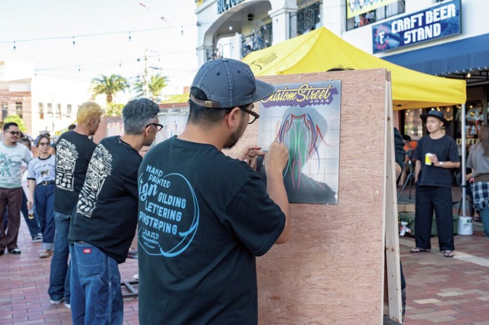 好みのアーティストを見つけてペイントのオーダーをすることも可能。自走参加の車両にその場でピンストライプを加える光景がアチラコチラで見られた。手描きの筆から生まれるハンドメイドのカスタムだ。