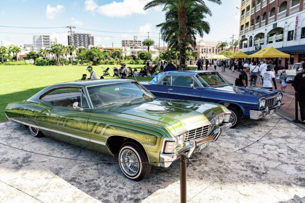 ジバゴ前に並ぶ’56シェビー、’60シェビーはオリジナル基調のクリーンなスタイル。’59キャディラックのスペーシーなデザインが椰子の木が並ぶ会場の雰囲気にマッチ。広場前に展示されたグリーンの’67シボレー・インパラは愛知CHOLO’Sがペイントを手がけた珠玉のローライダー。