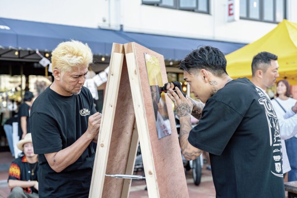 左が前身の2&4カスタムマニアックスを立ち上げた8ポイント仲西さん。そして右が中西さんの意思を受け継ぎ、2&4カスタムストリートを主催するKENTさん。ピンストライパーが主体となって発信する沖縄流儀のカスタムカルチャーに注目したい。