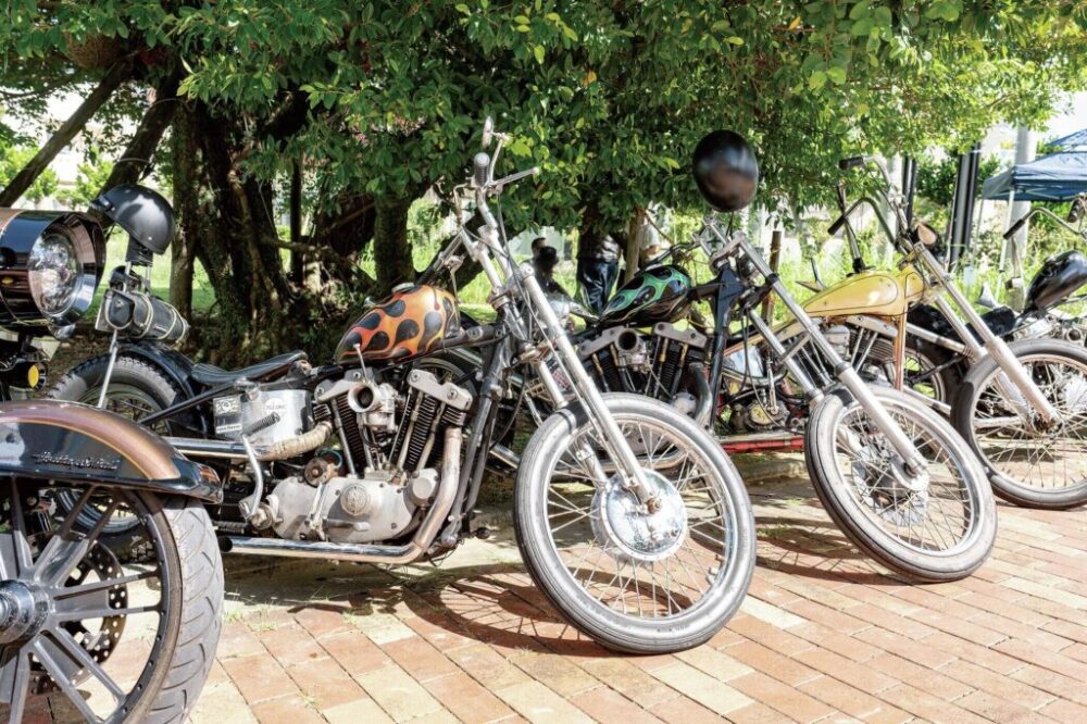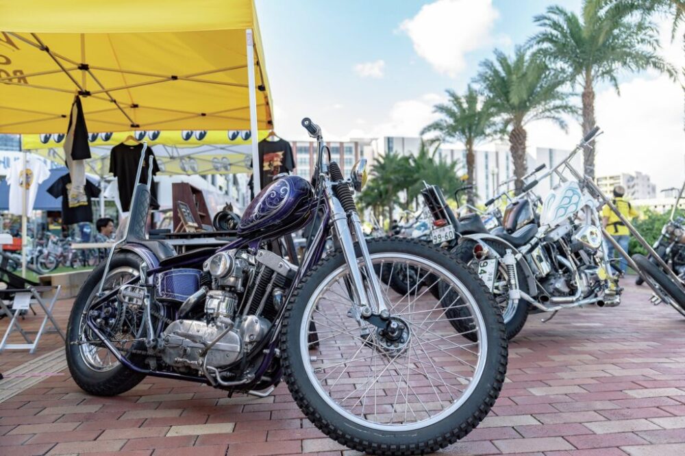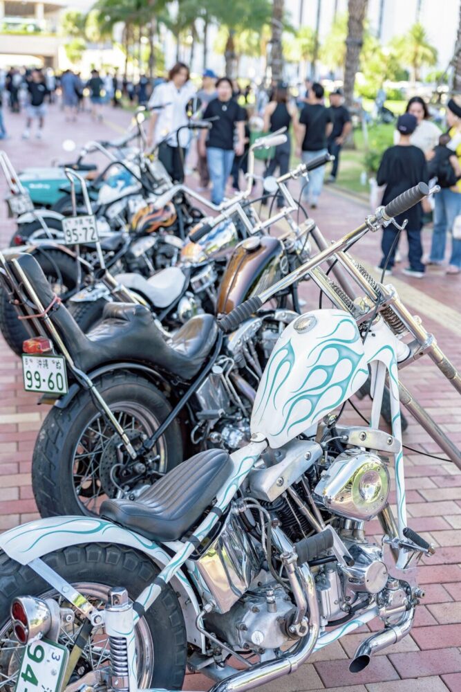 モーターサイクルはH-Dを中心にヴィンテージモーターのチョッパーが多数エントリー。オールドスクールなセンスが色濃く、走りを楽しむリアルなチョッパーが並んだ。