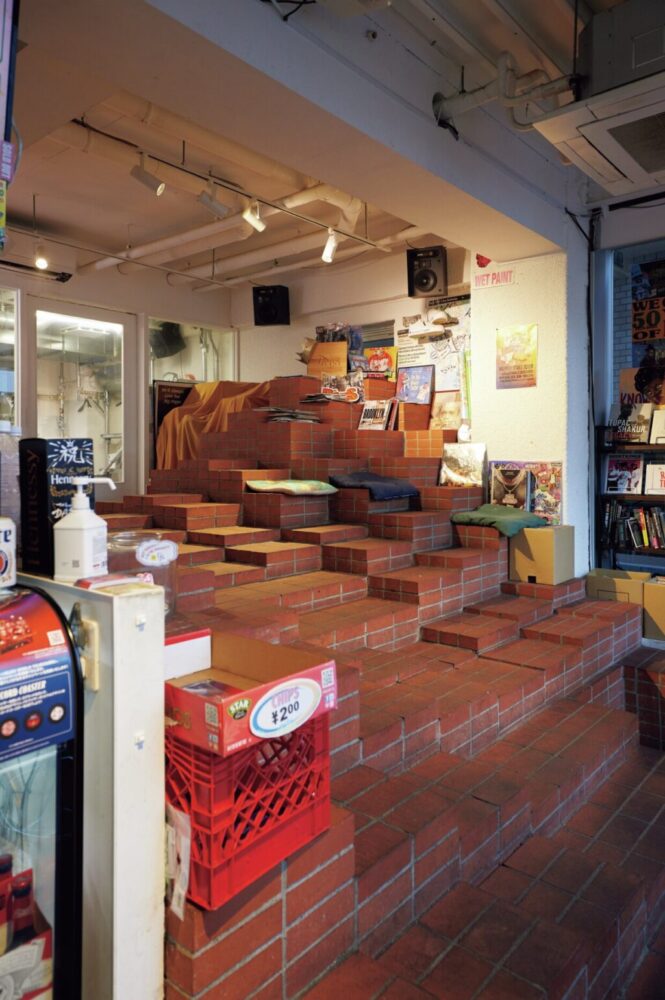 NYハーレム地区でよく見られる、レンガの外壁と入口から歩道まで伸びた階段が特徴的な建築様式がそれだ。吉祥寺『ザ・ダップス・フェイマス・フード・ジョイント』オーナーの一人・宮本佳和さんは、そのブラウンストーンにインスパイアされた巨大なレンガの階段を店内に大胆に配した。