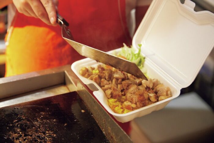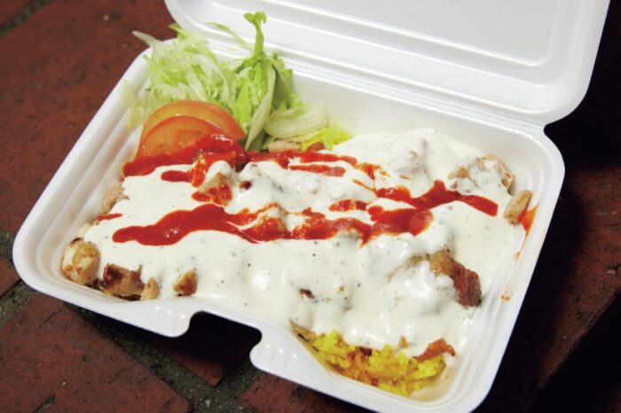 ヨーグルトソースとホットソースが効いているチキンオーバーライス。「超有名店の味をヒット曲が入ったレコードのA面とするなら、僕らのはB面のHOOD(地元)の味。でもB面のほうがカッコいい場合も多いでしょ」1000円