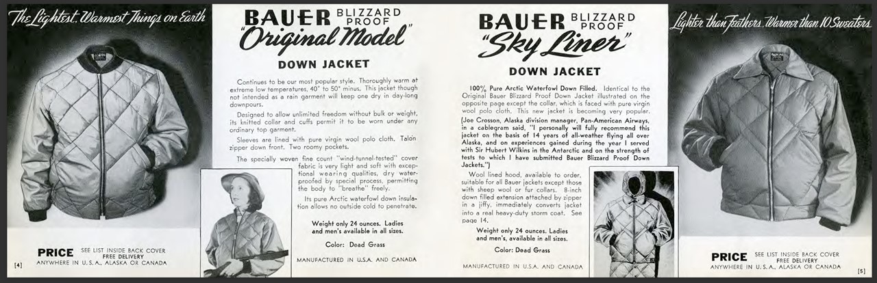 そんな体験をしたエディーは、伯父に聞いた話を思い出していた。それは日露戦争時代にダウンを使用した温かく軽量なジャケットのことであった。その話から、ダウンの有用性を知っていたエディーは、アメリカ北西部とアラスカの雪に立ち向かうアウトドアズマンのために、人生を賭けグースダウンを使用したジャケットを製造していくことになる。そして、九死に一生を得る体験をした翌年の1936年にアメリカ初のダウンジャケット「スカイライナー」が誕生したのだ。